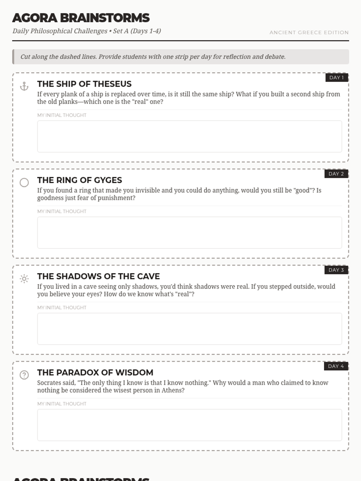 A set of eight printable strips featuring classic Ancient Greek philosophical paradoxes and thought experiments, designed for middle school students to reflect on identity, logic, and ethics.