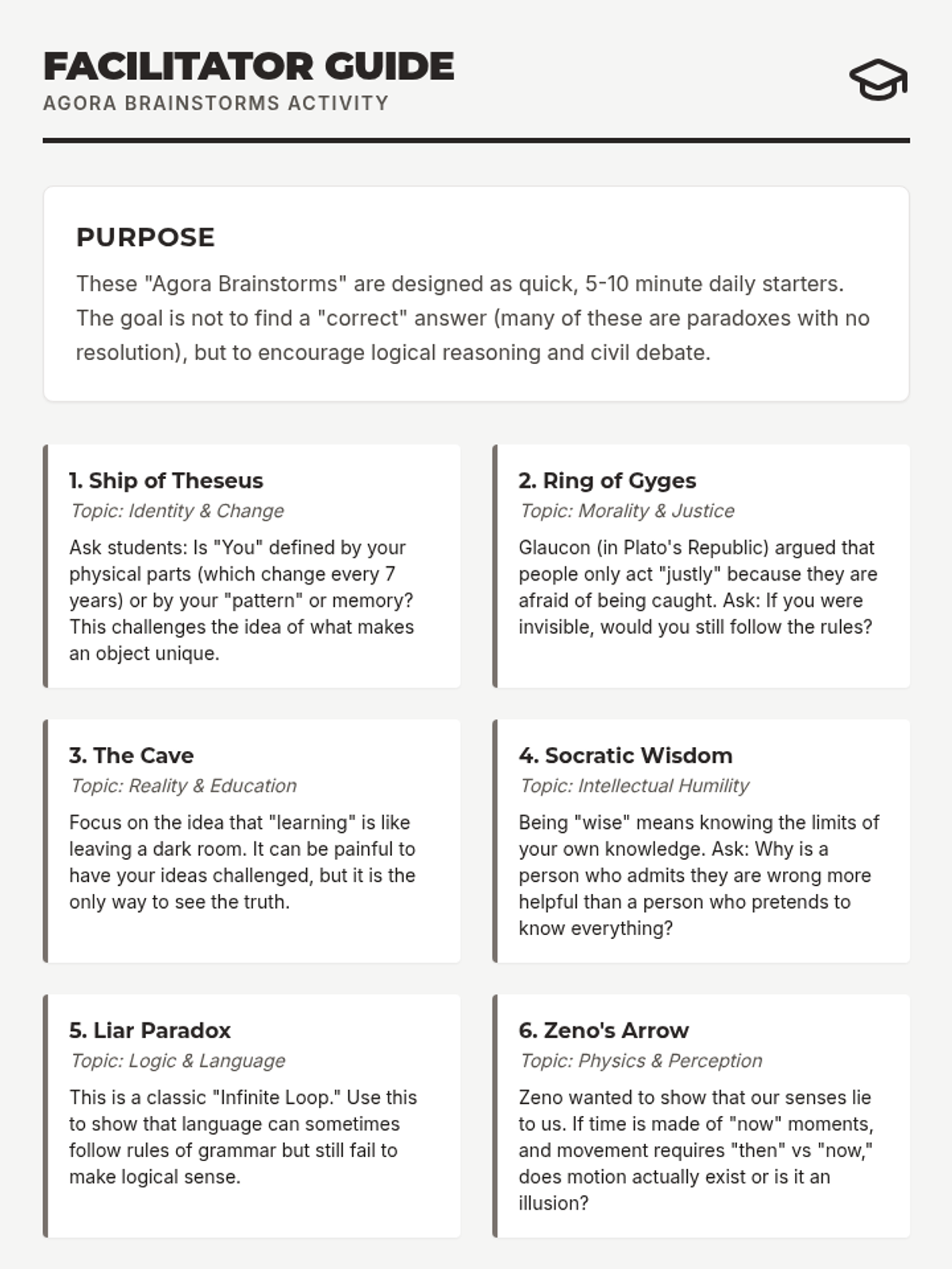 A facilitator guide for teachers to lead discussions based on the Agora Brainstorms philosophy strips, providing historical context and talking points for each paradox.