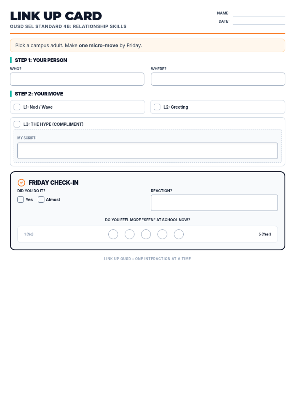 A student worksheet to help 7th graders plan their "micro-interactions" with campus adults, including a space to identify a target adult and track their connection challenge. Revised to fit on one page and improve input area sizing.