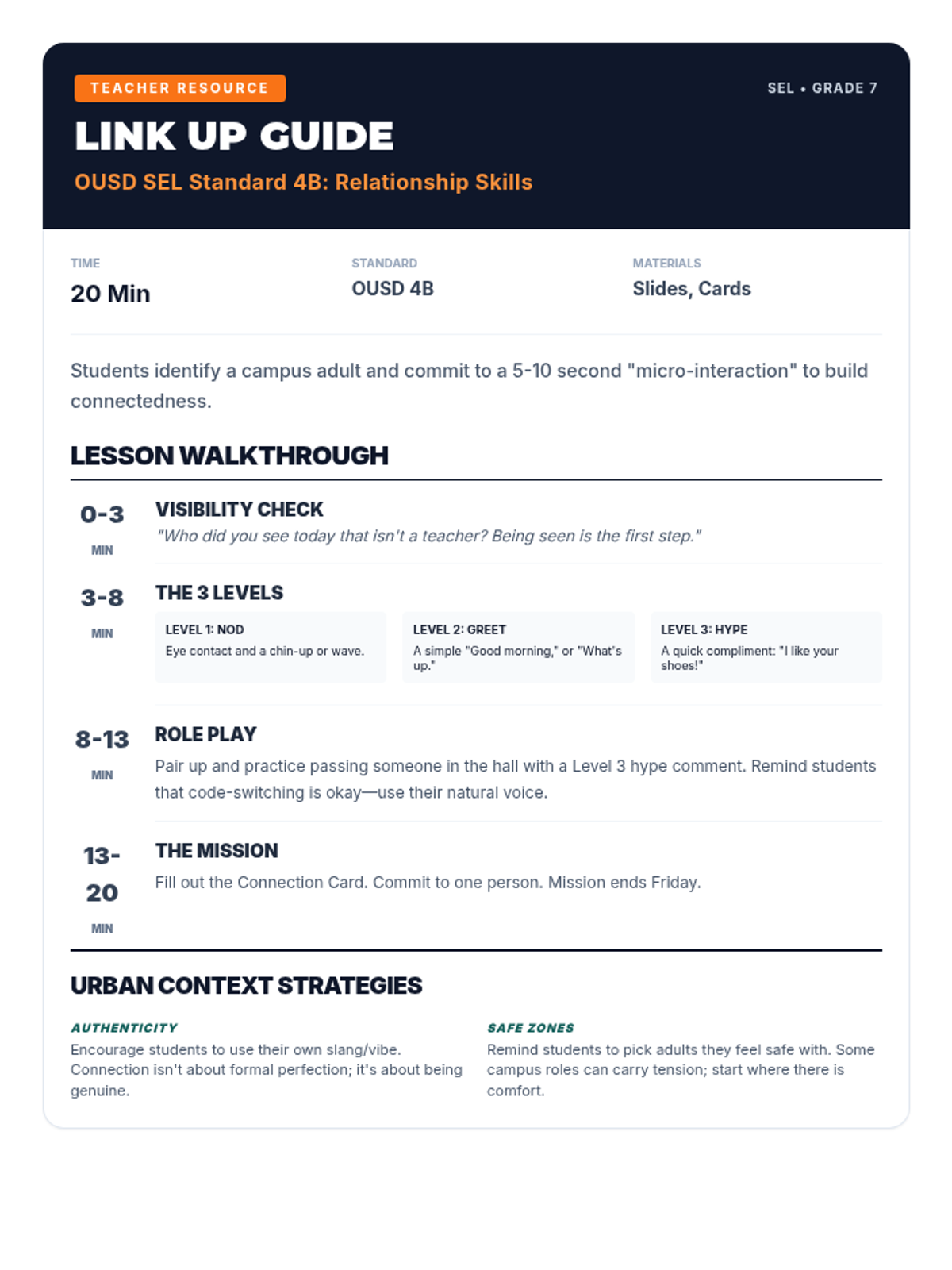 A detailed teacher's guide for the 'Link Up' SEL lesson. Revised to prevent awkward page breaks and ensure clear section grouping.