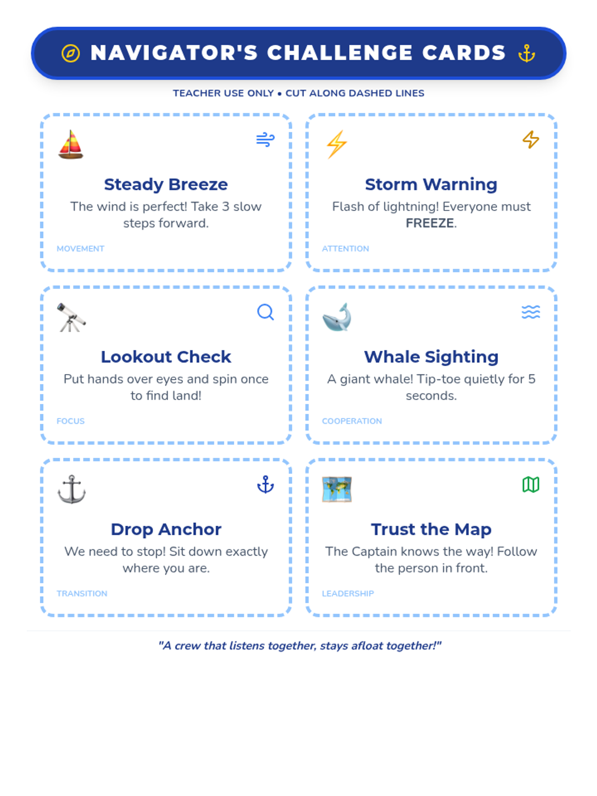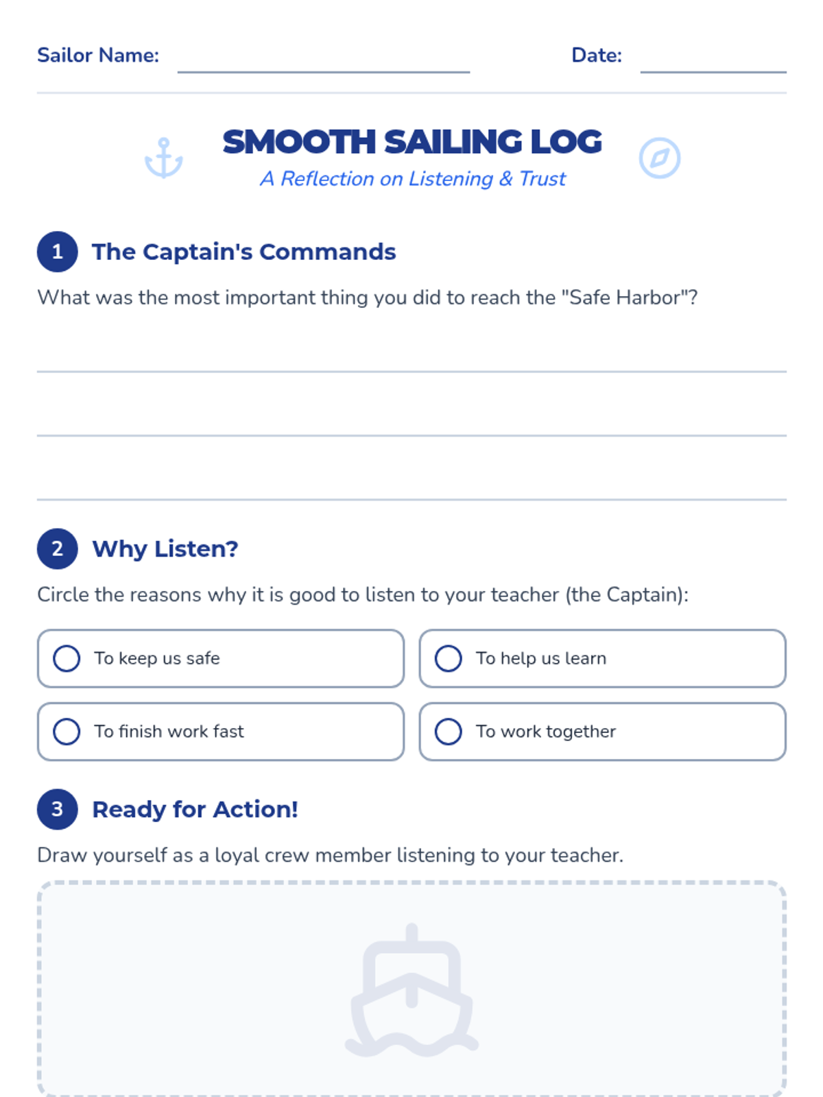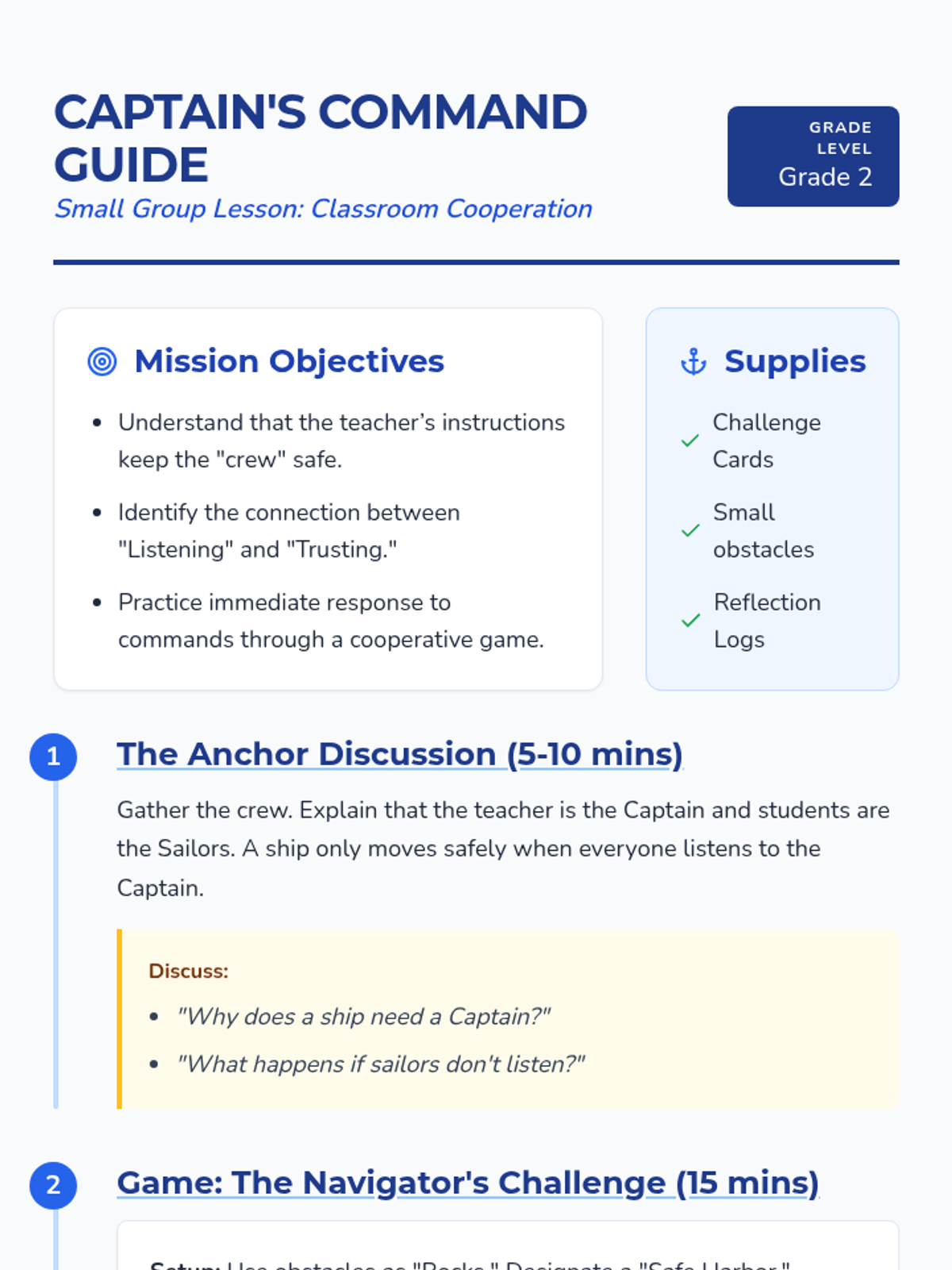 A detailed lesson plan for teachers, using a 'Captain and Crew' maritime theme to teach 2nd graders the importance of following directions and trusting their teacher. Includes discussion prompts, game instructions, and reflection tips.