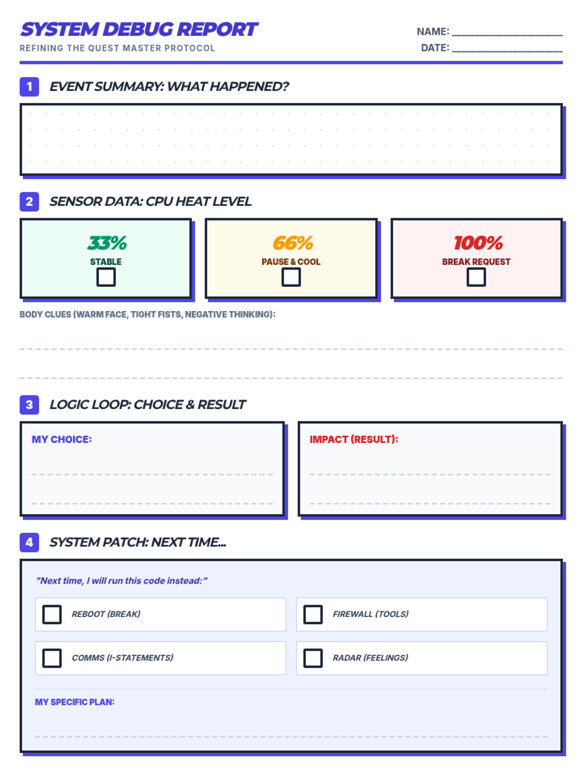 A reflection 'think sheet' for students to process behavioral incidents, framed as a 'System Debug Report'. It guides students through identifying body signals (CPU Heat), analyzing choices (Logic Loops), and selecting a replacement strategy (System Patch). Updated to include I-Statements label.