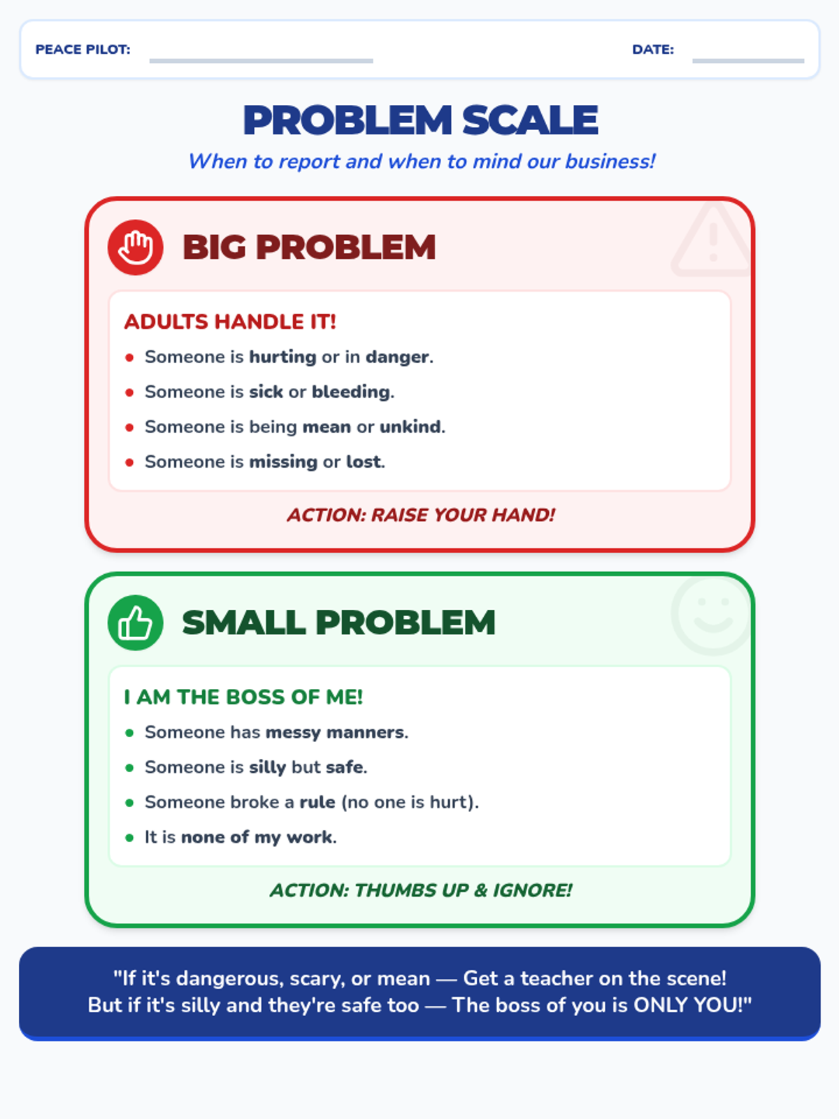 A visual reference sheet for kindergarteners defining the difference between 'Big Problems' that need adult help and 'Small Problems' where students should mind their own business.