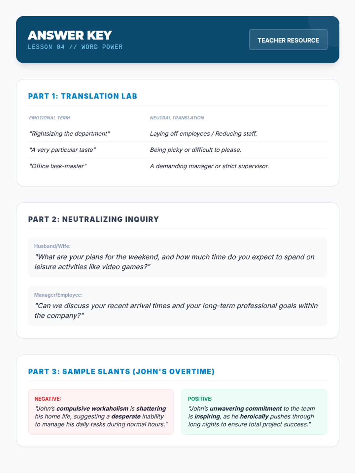 Complete answer key for the updated Lesson 4 worksheet, providing neutral translations and neutral inquiry rewrites for interpersonal scenarios.