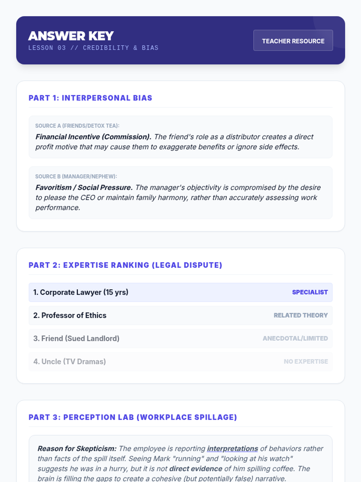Complete answer key for the Lesson 3 worksheet, covering bias identification, expertise ranking, and analysis of eyewitness reliability factors in relationship and work contexts.