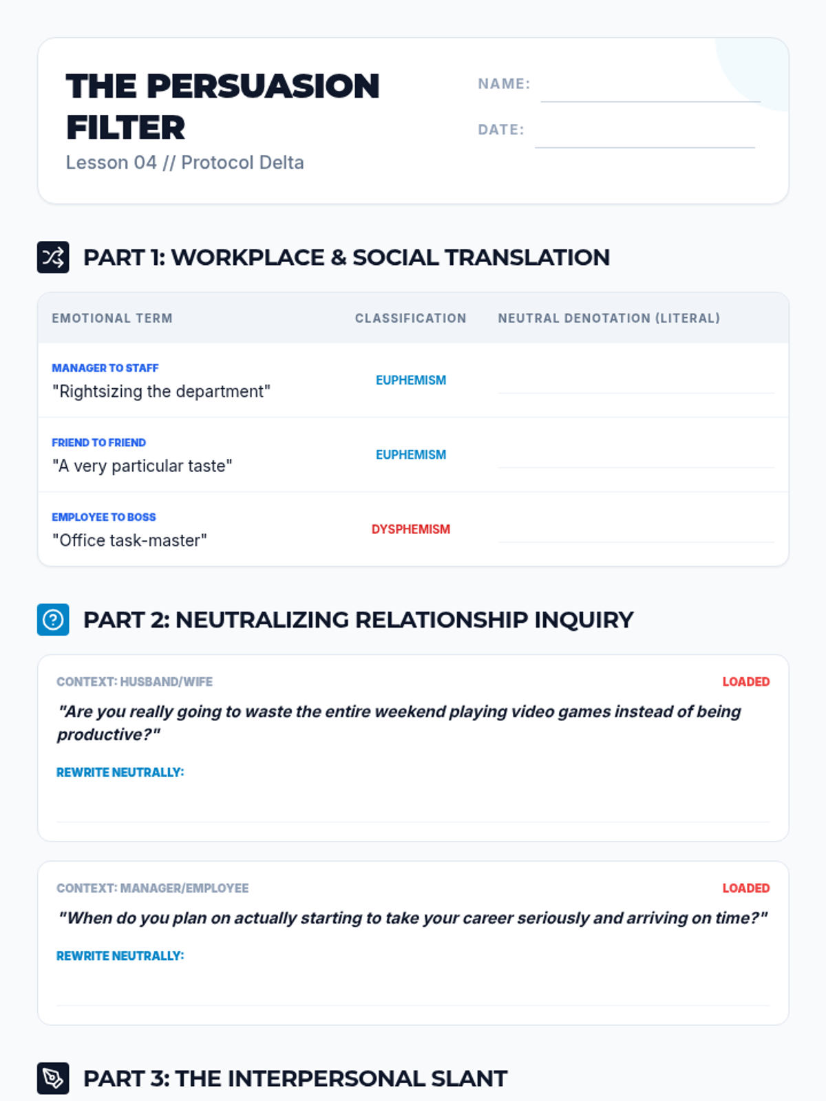 Student worksheet for Lesson 4 focusing on euphemisms and biased questioning within workplace, marriage, and friendship contexts.