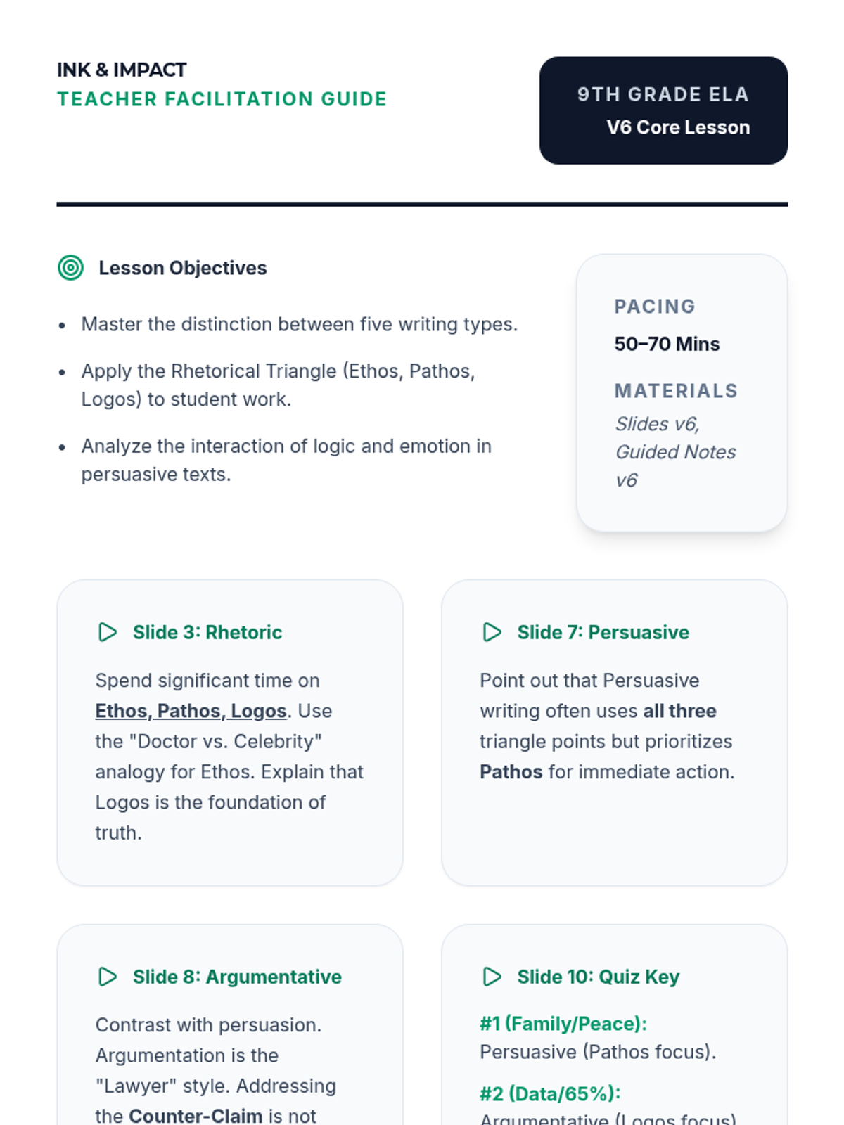 An updated teacher guide for 9th grade including notes on the Rhetorical Triangle and revised activity examples. Refined layout for better contrast and clarity. Match with v7 slides and notes.