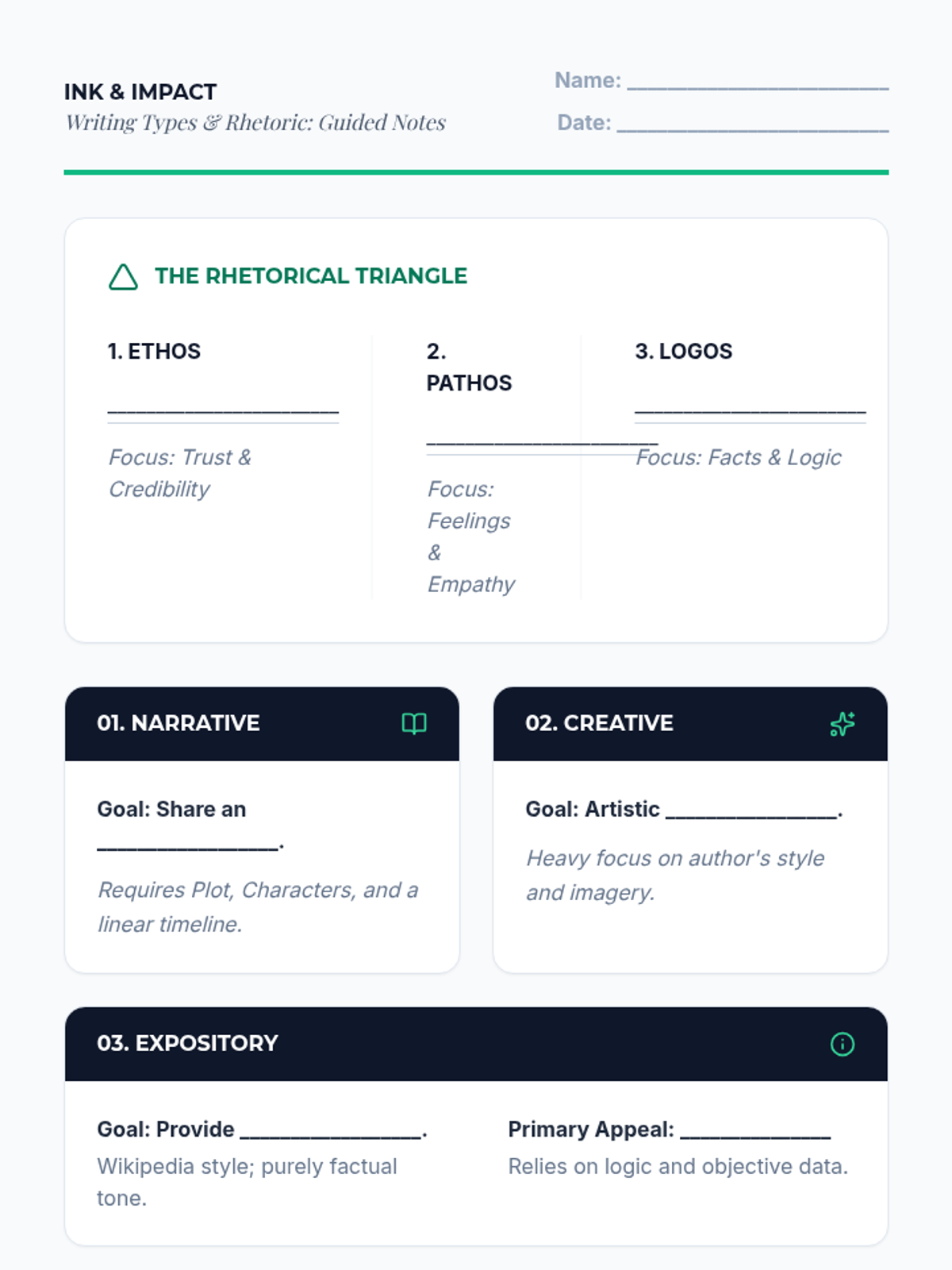 A high-quality, single-page guided notes assignment for 9th graders. Optimized for print with clear contrast, generous handwriting areas, and a cohesive instructional flow. Includes a dedicated rhetorical triangle section.