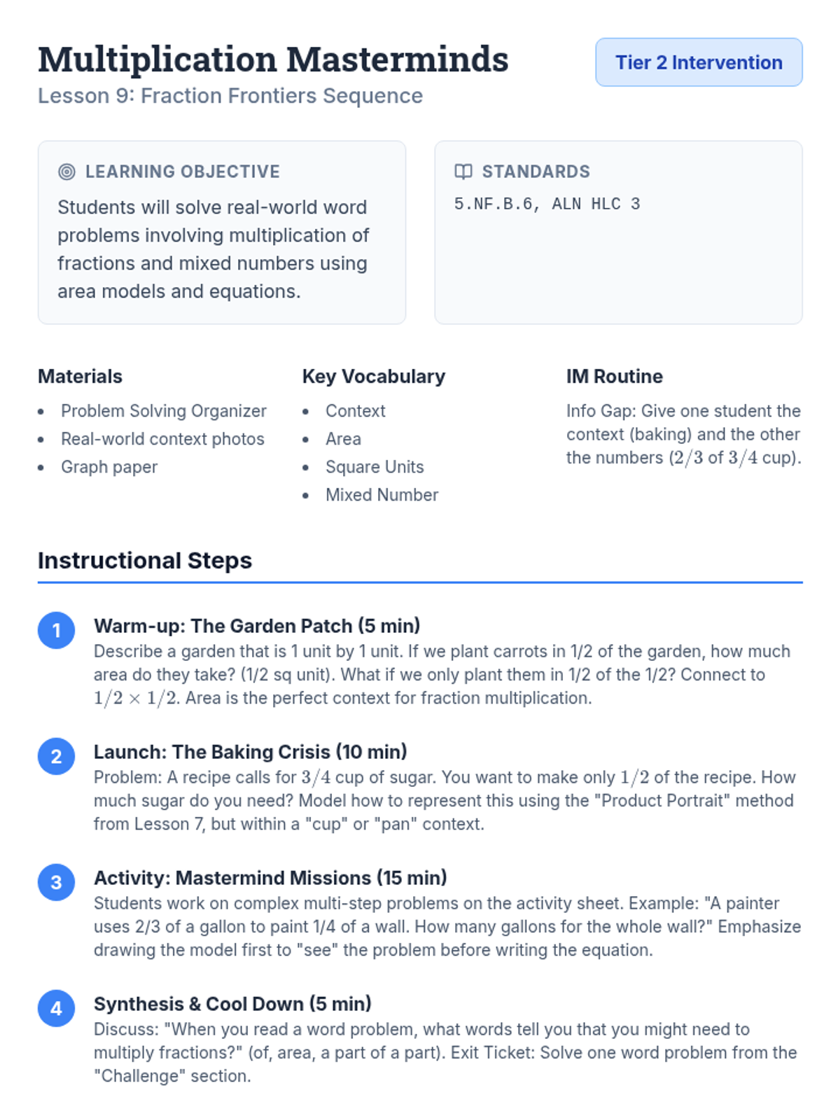 Detailed lesson plan for solving real-world word problems involving fraction multiplication. Focuses on area contexts and using models to interpret problem structure.