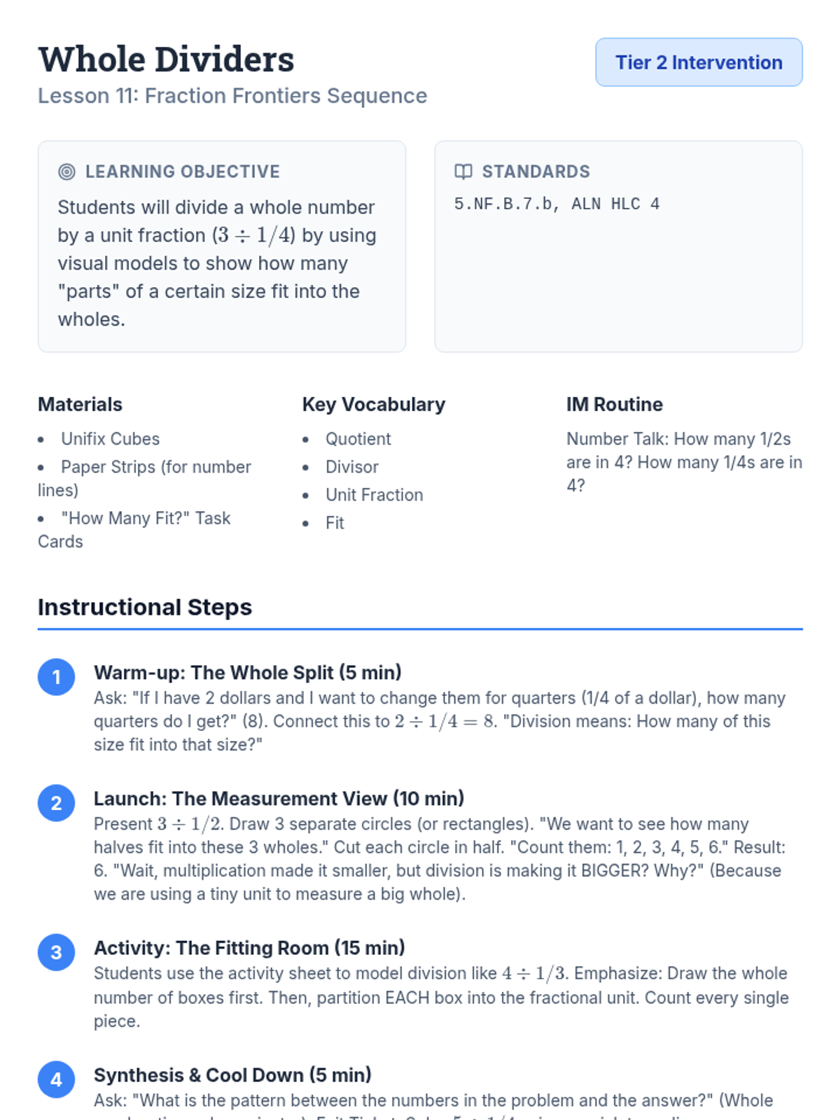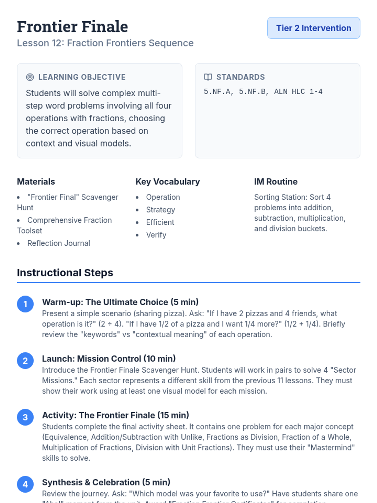 Final review lesson plan for the Fraction Frontiers sequence. Integrates all four operations and focuses on choosing the correct conceptual model for varied word problems.