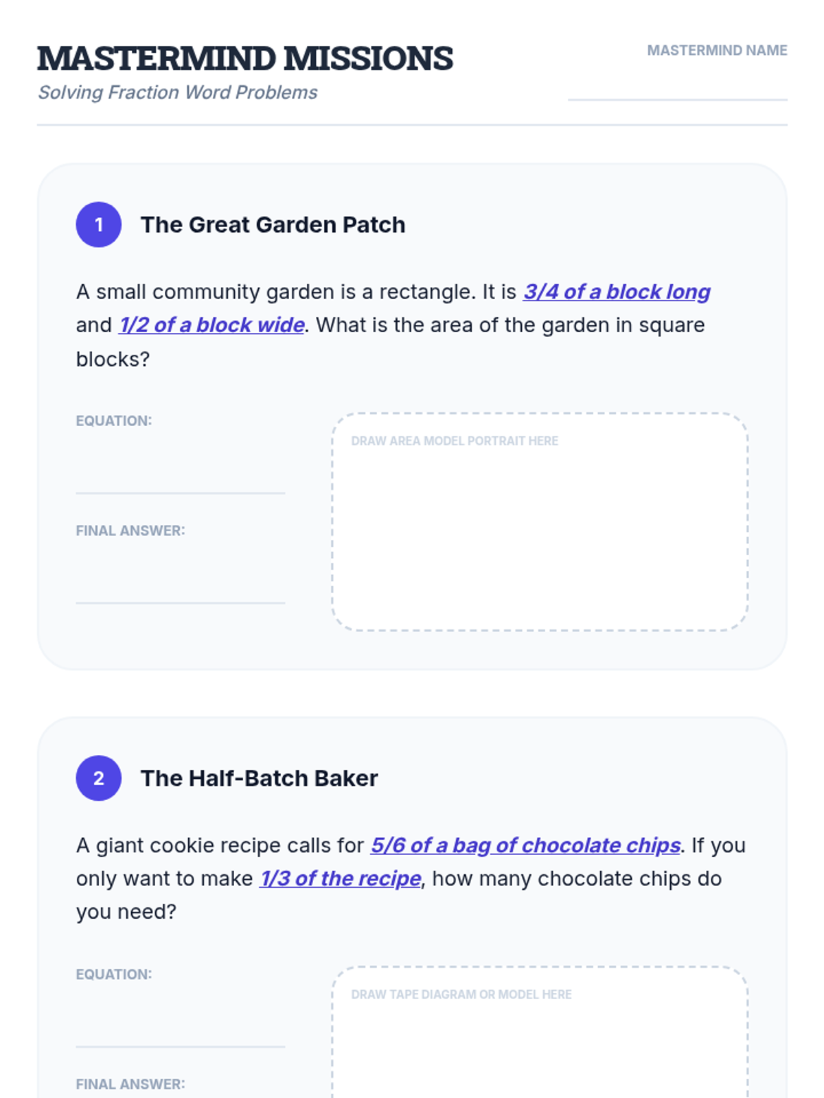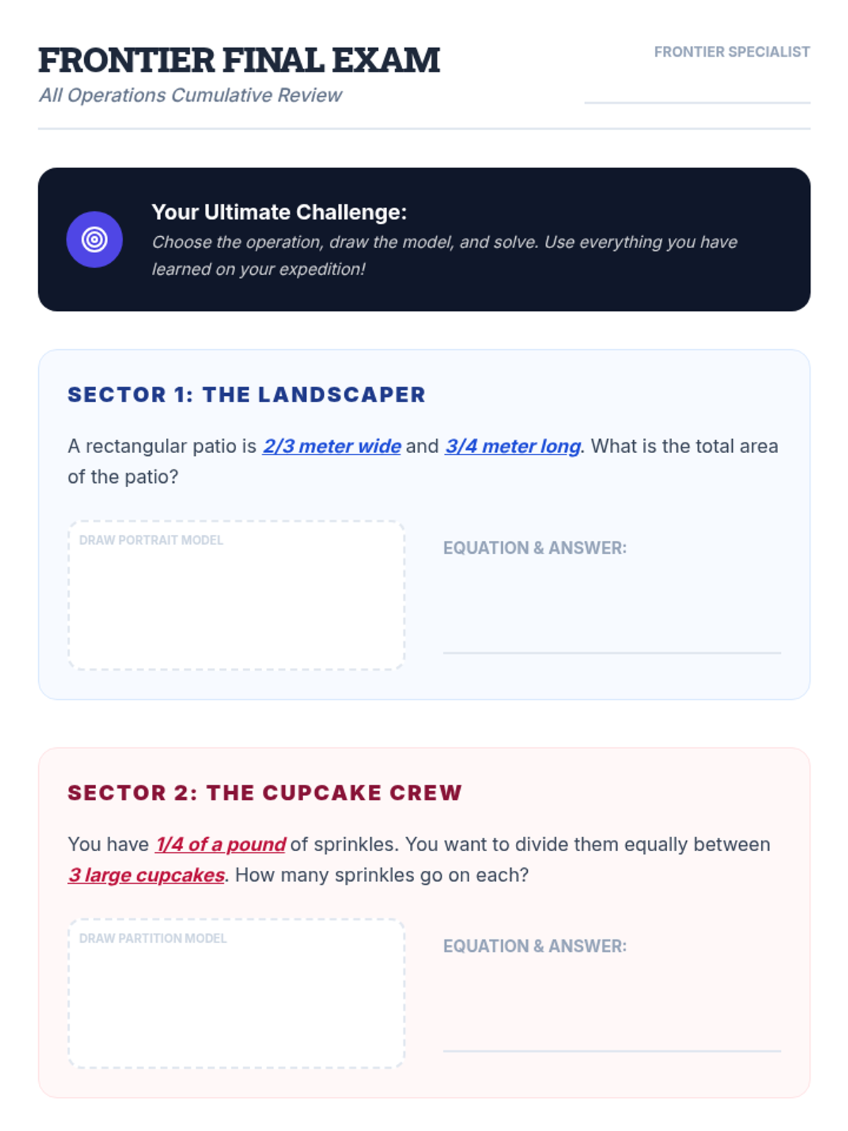Final cumulative assessment for the Fraction Frontiers sequence. Students must solve four varied word problems using the correct models and operations learned throughout the unit.