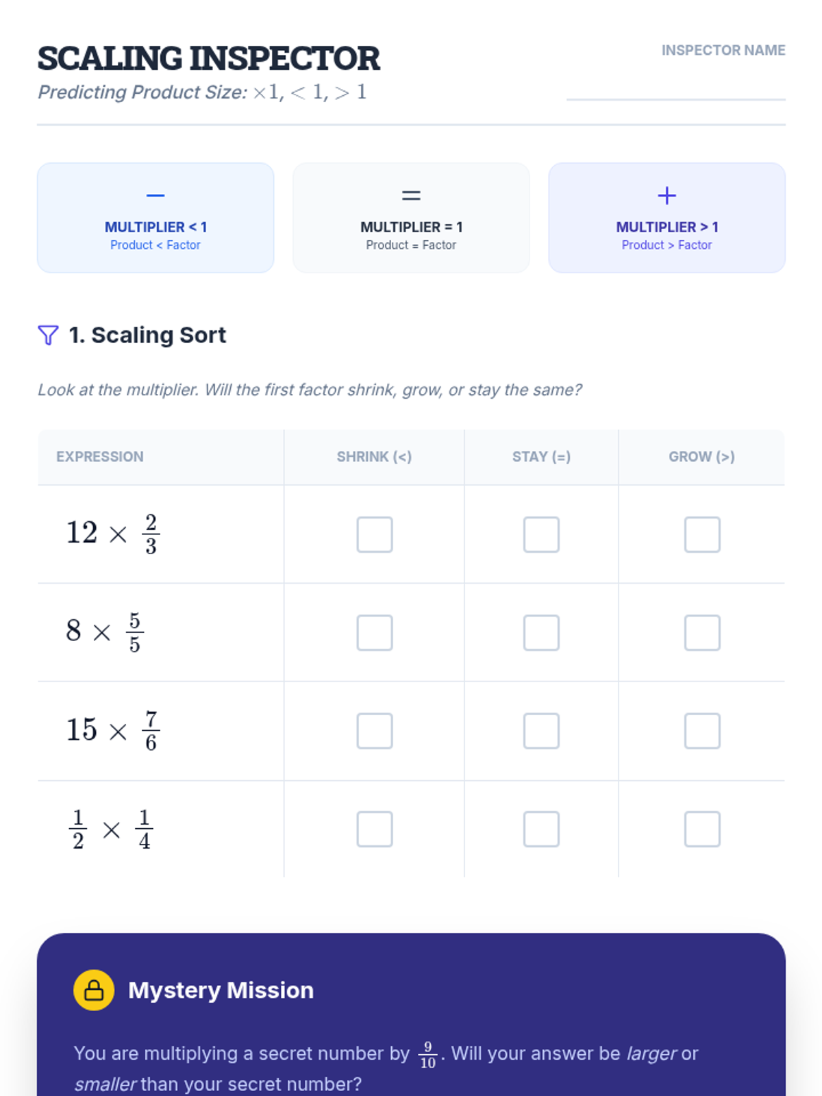 Student activity worksheet for Lesson 8, practicing multiplication as scaling by predicting product size relative to factors without calculating.