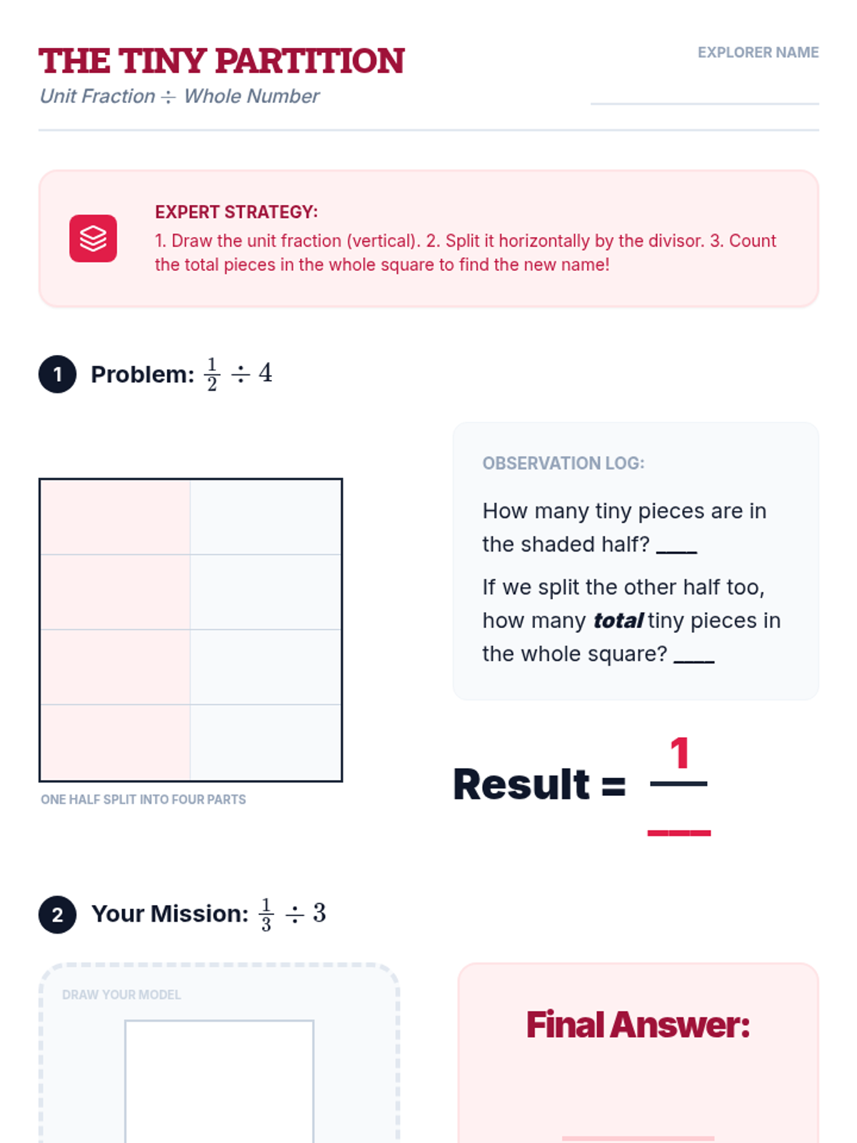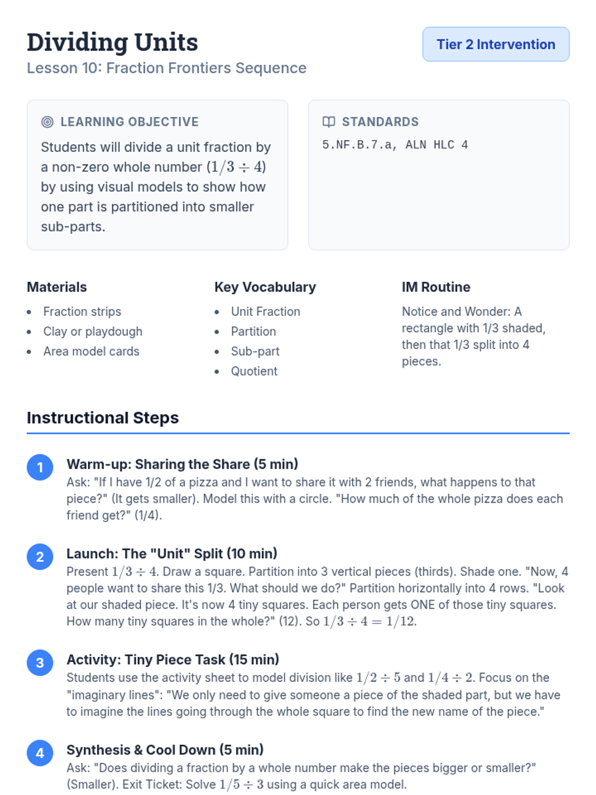 Detailed lesson plan for dividing unit fractions by whole numbers. Focuses on the "partition of a part" concept using area models.