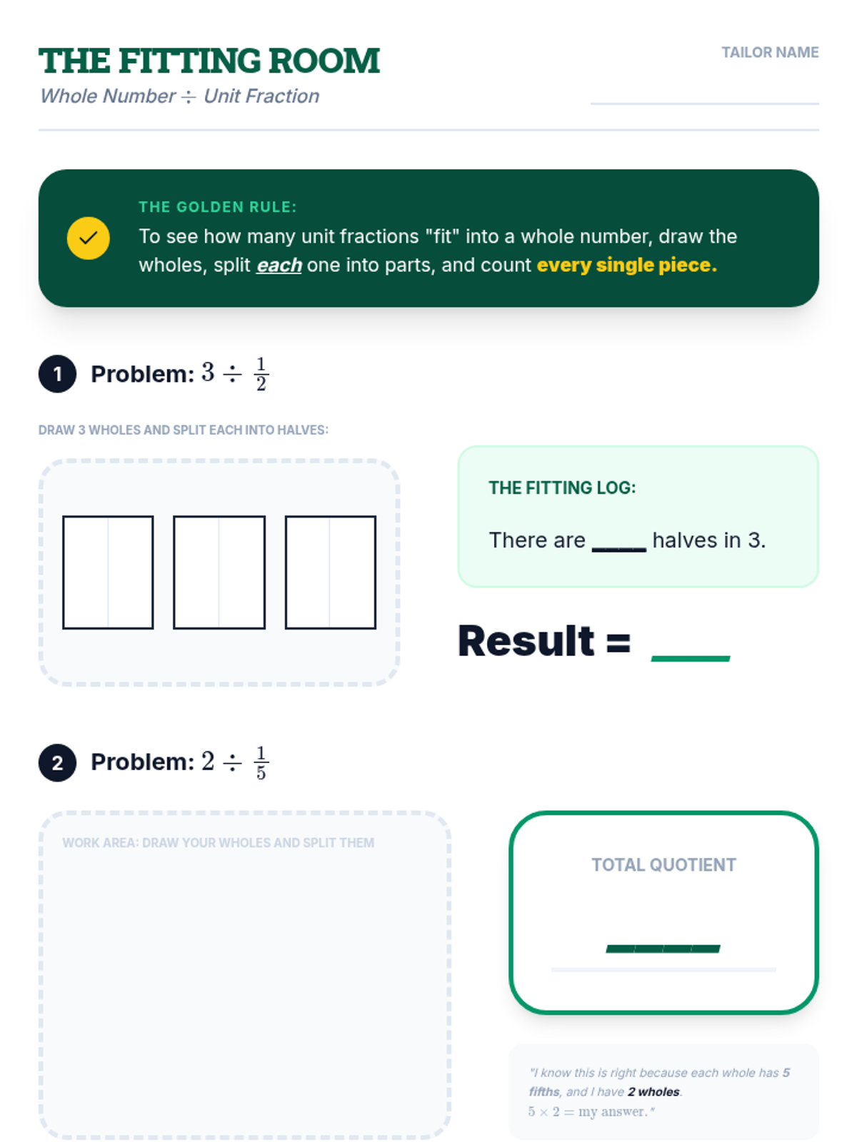 Student activity worksheet for Lesson 11, focusing on dividing whole numbers by unit fractions using "fitting" visual models and counting pieces.