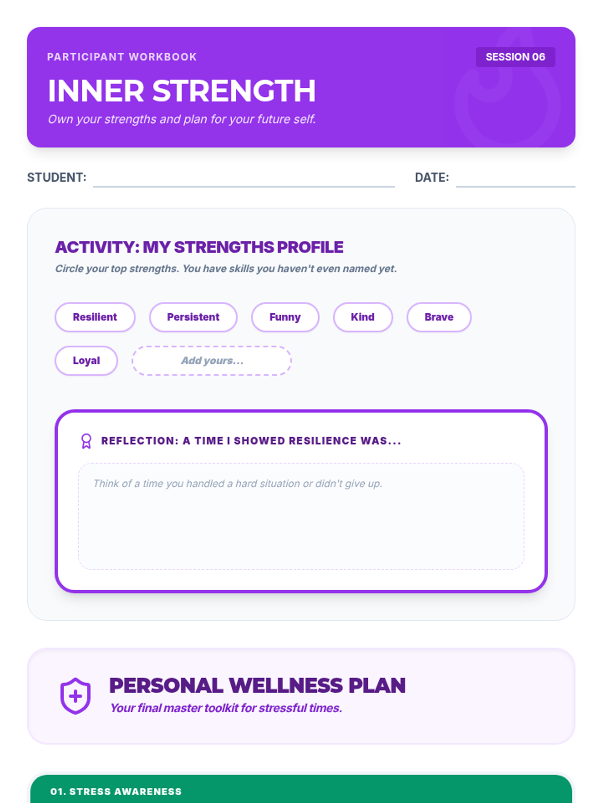 Final participant workbook for Session 6 with corrected Wellness Plan layout. Writing areas for all wellness sections have been significantly increased for handwriting, and labels have been darkened for better legibility. Strength pills and alignment optimized for professional print finish.