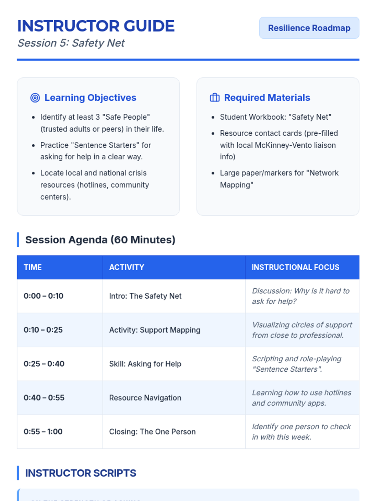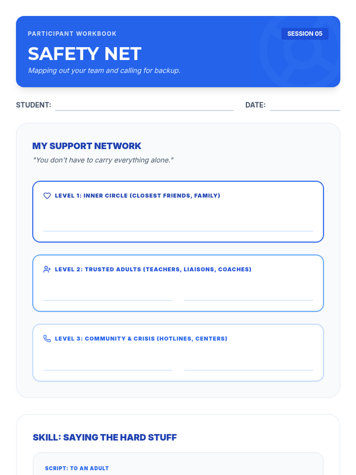 Participant workbook for Session 5 featuring a larger, more usable Support Network Map and significantly increased writing space for conversation scripts. Emergency resources highlighted with high contrast for quick reference.