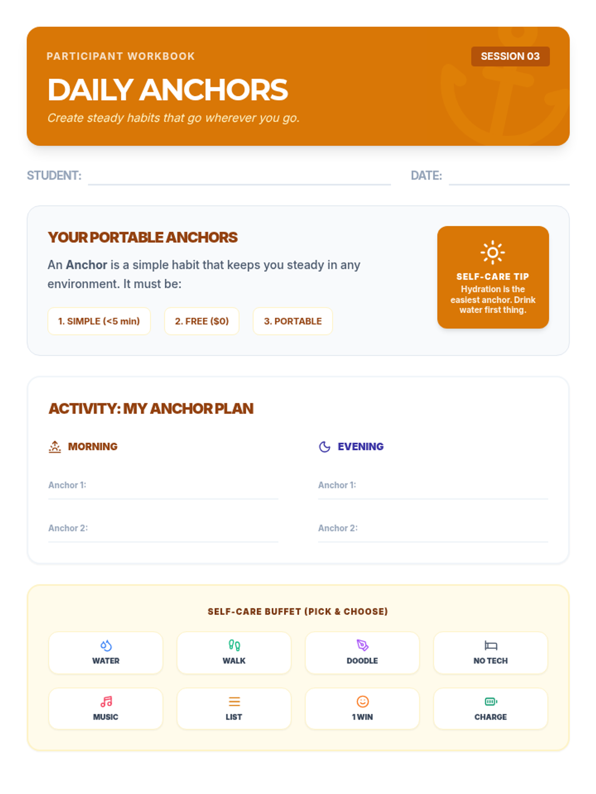 Participant workbook for Session 3 with optimized single-page layout. Includes improved text contrast for the self-care tip and a layout fix for the self-care buffet grid to prevent page break splitting.