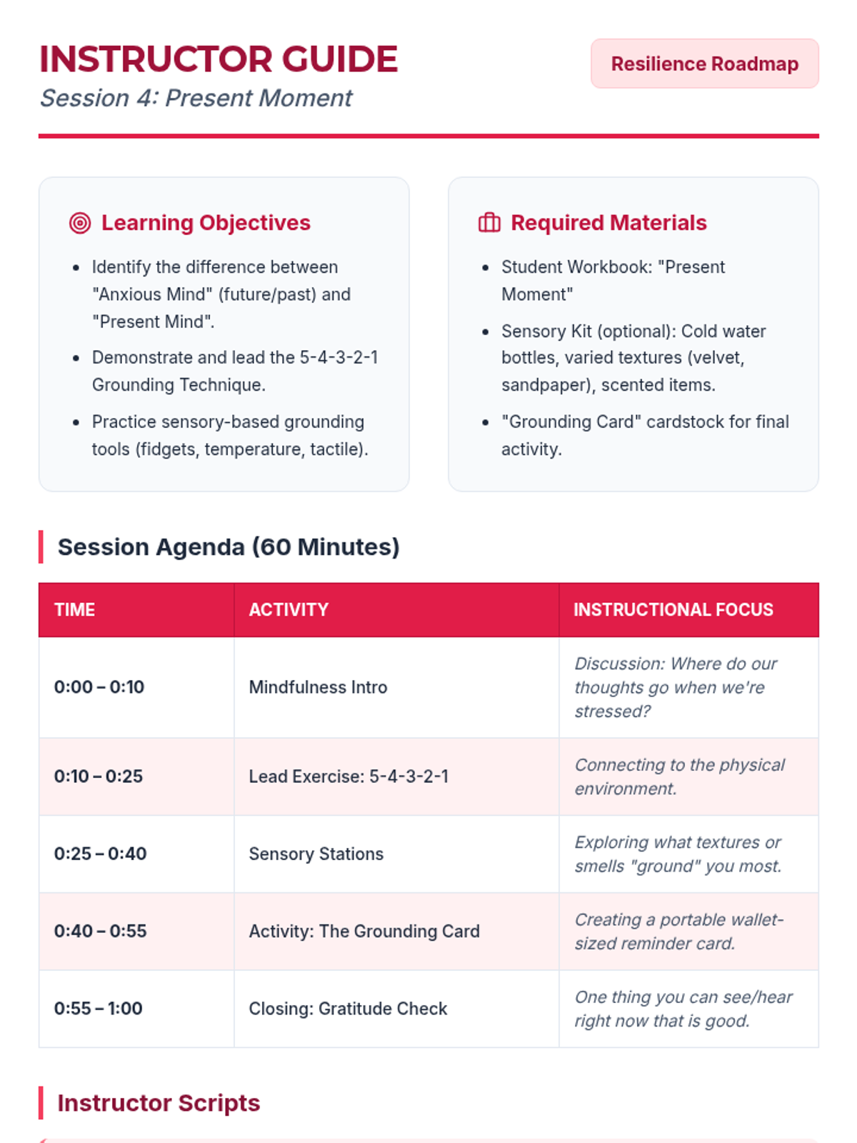 Instructor manual for Session 4, providing guidance on teaching grounding techniques like 5-4-3-2-1 and sensory-based mindfulness strategies.