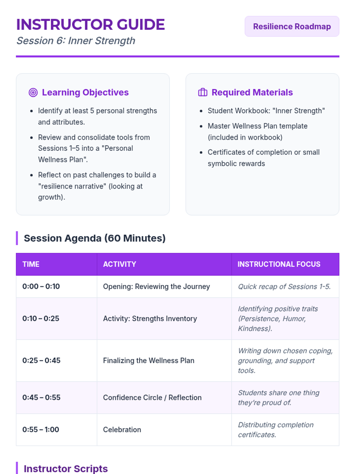 Instructor manual for the final session (Session 6), focusing on resilience, strengths identification, and the creation of a master personal wellness plan.