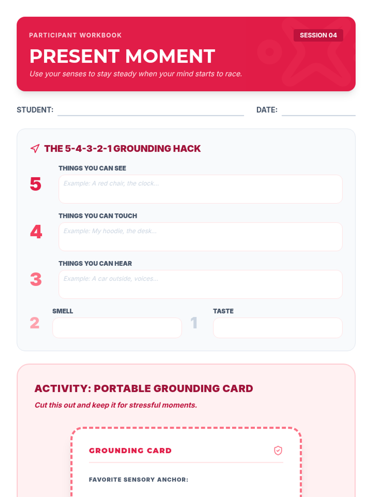 Participant workbook for Session 4, featuring significantly expanded writing space for the 5-4-3-2-1 exercise, a single-page optimized grounding card activity, and improved text contrast for clarity.