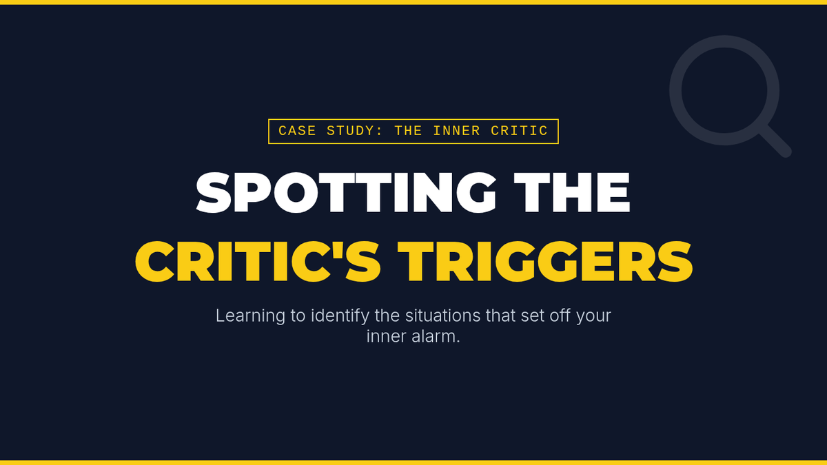 A slide deck for an 8th-grade lesson on identifying Inner Critic triggers, featuring sections on defining triggers, common 8th-grade scenarios, physical warning signs, and the '5-Second Pause' strategy.