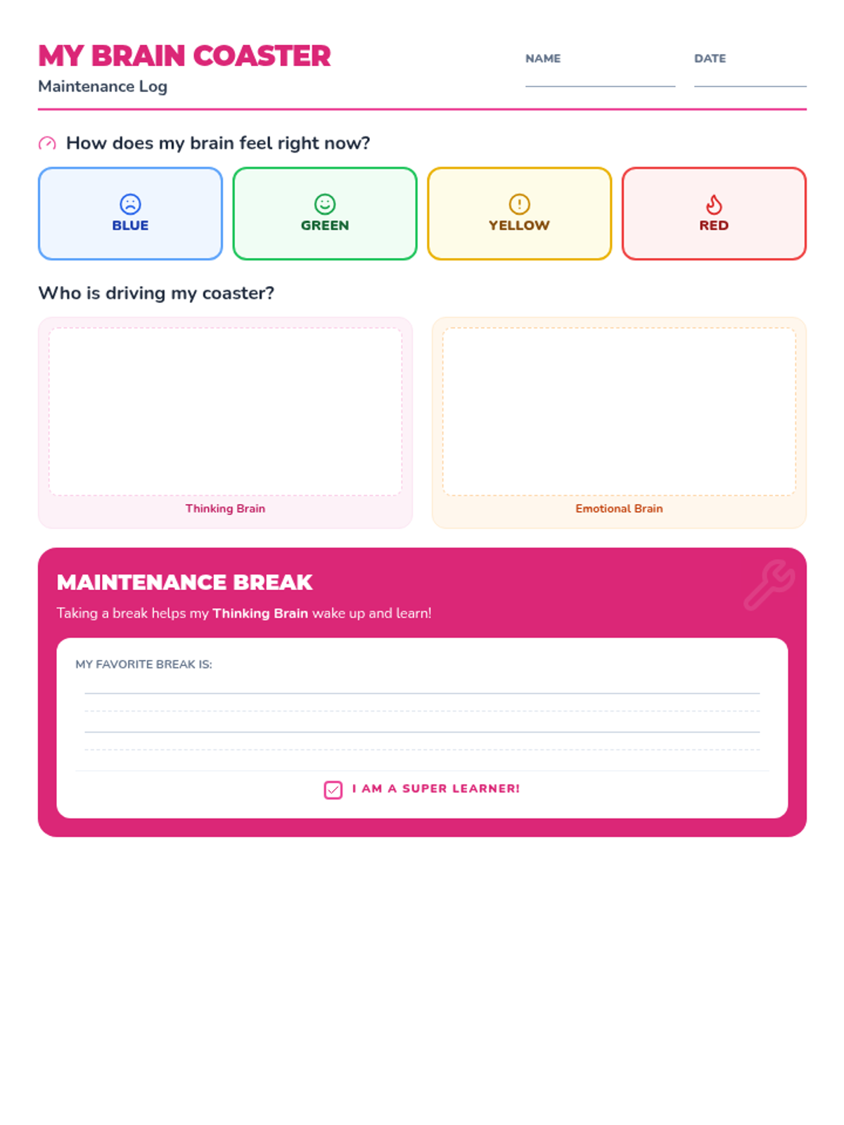 A student-facing worksheet using the rollercoaster theme to help students identify their current zone and plan a 'maintenance break' to re-engage their thinking brain. Features visual icons for 1st-grade support and improved handwriting spaces. Optimized for single-page print.