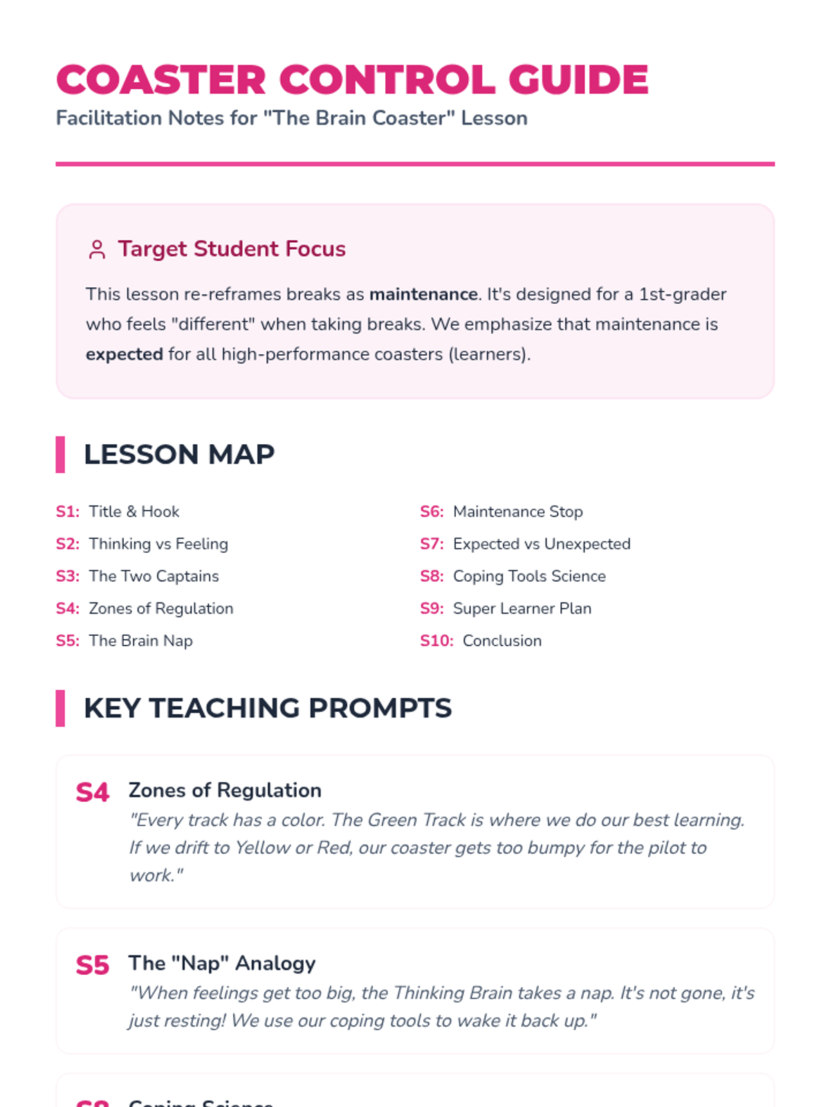 Updated teacher facilitation guide for the Brain Coaster lesson, providing prompts for the new Zones slide, updated analogies, and a full lesson map. Fixed character encoding issues.
