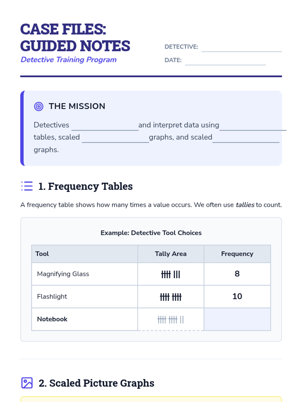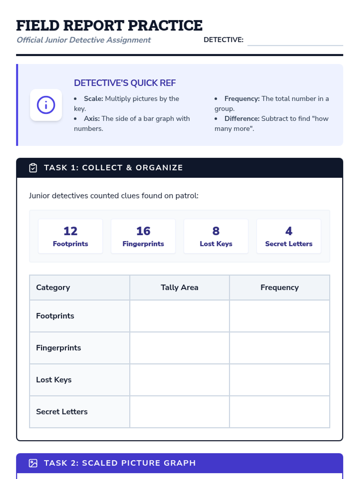 A visual observation puzzle where students tally pizza toppings to solve a freezer unlock code. Scrambled tally list and clarified size-based sorting logic. Fixed page break and opacity.