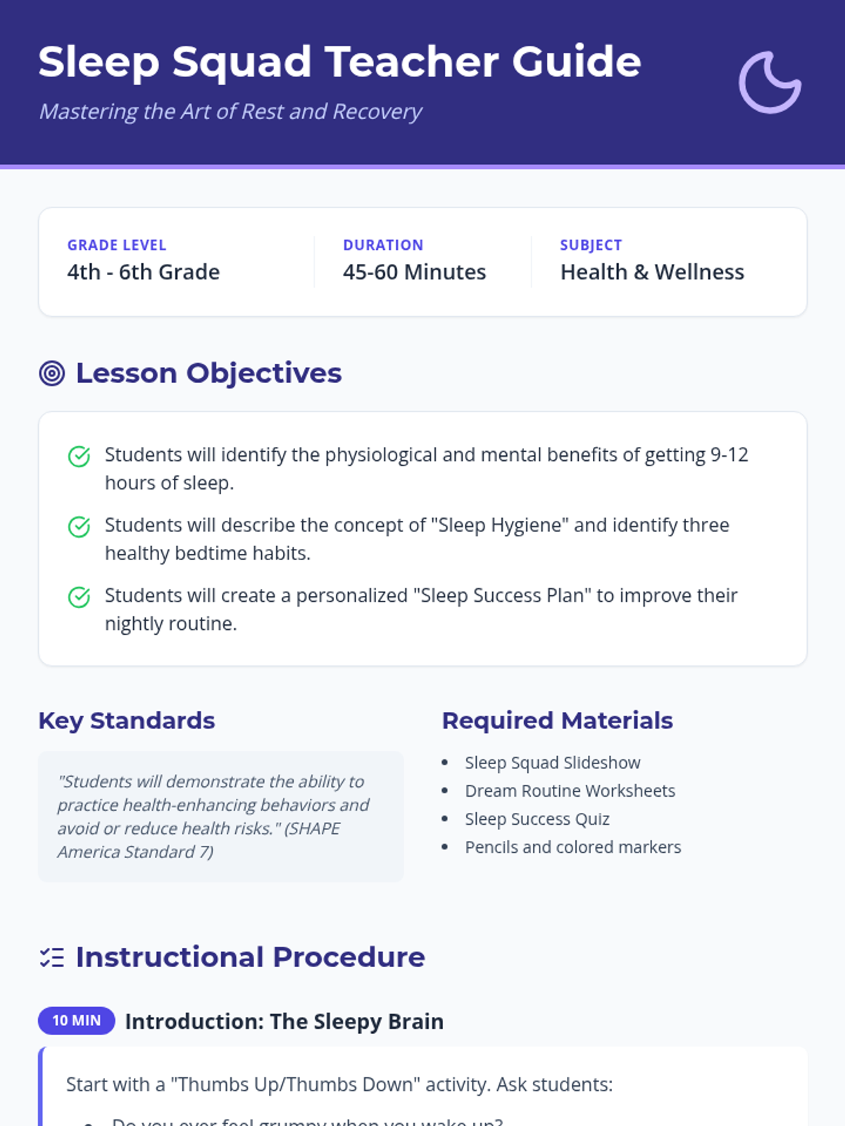 A detailed teacher's guide for the 'Sleep Squad' health lesson, including instructional procedures, objectives, and standards alignment. Revised to fix page break issues and orphaned headers.