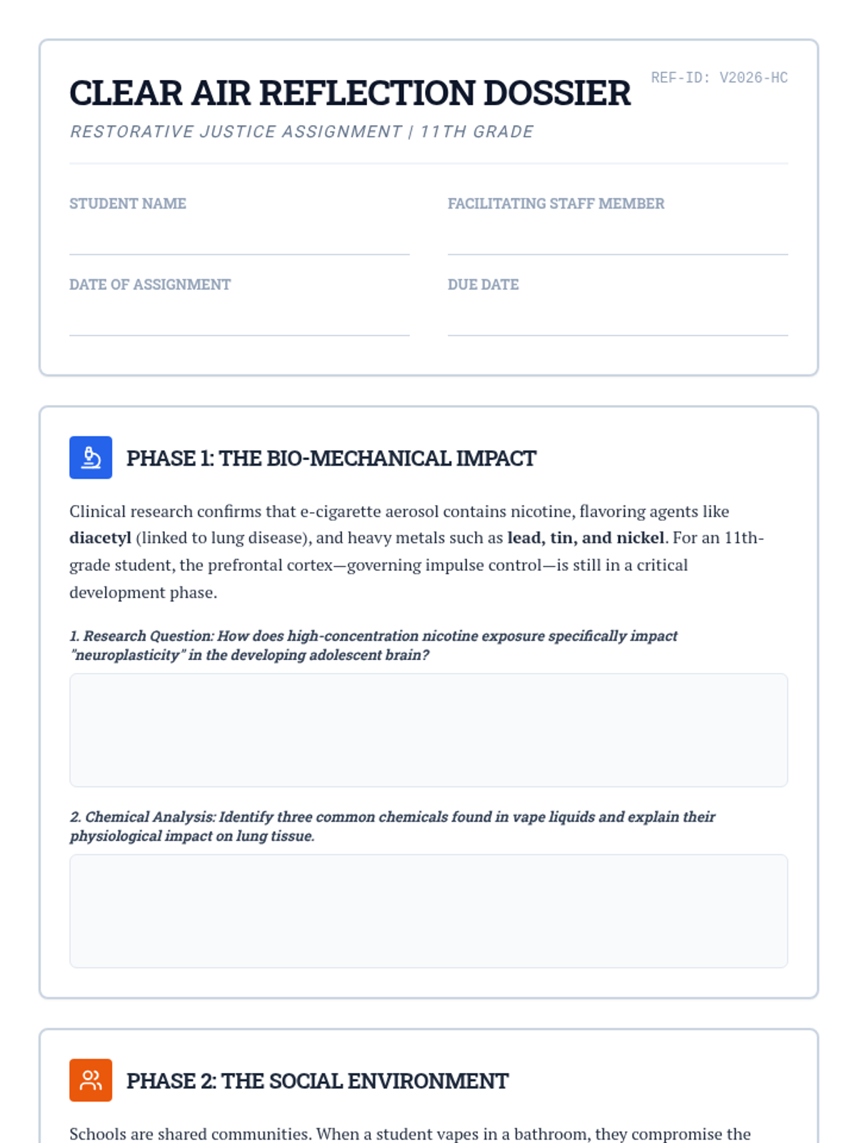 A reflective restorative justice assignment for a high school student caught vaping, focusing on health science, community impact, and personal growth.
