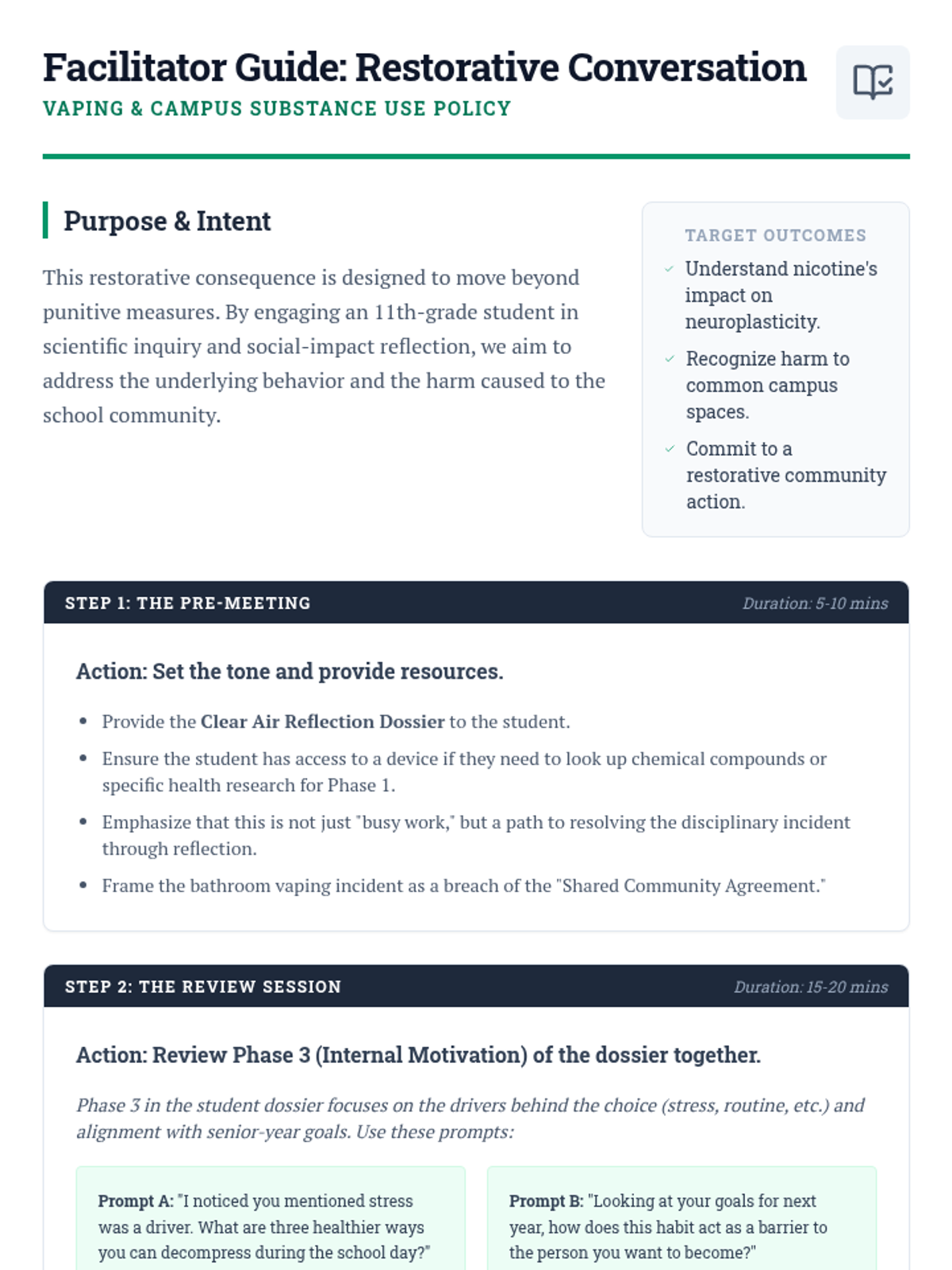 A facilitator's guide for school staff to manage the restorative conversation and follow-up for a student caught vaping.