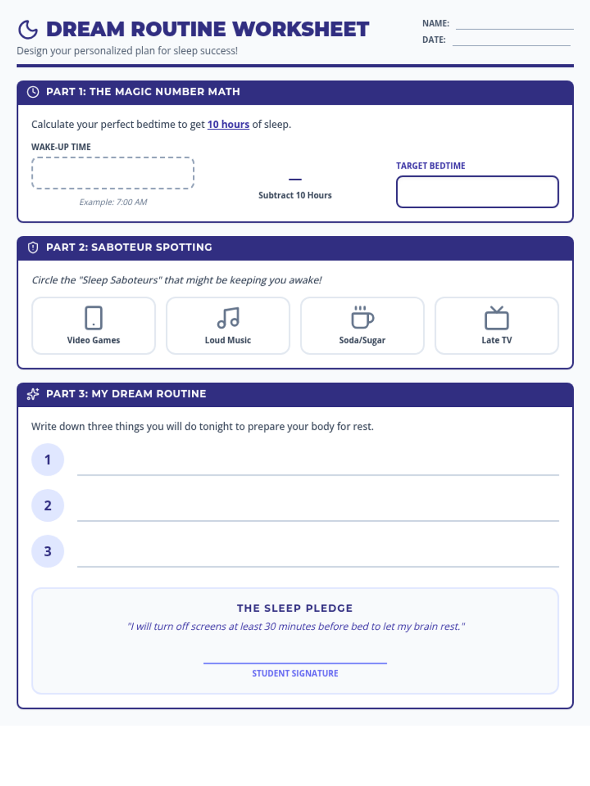 A student worksheet for planning a healthy bedtime routine, identifying sleep disruptors, and calculating target sleep times. Revised to ensure all content fits on one page and improves contrast.