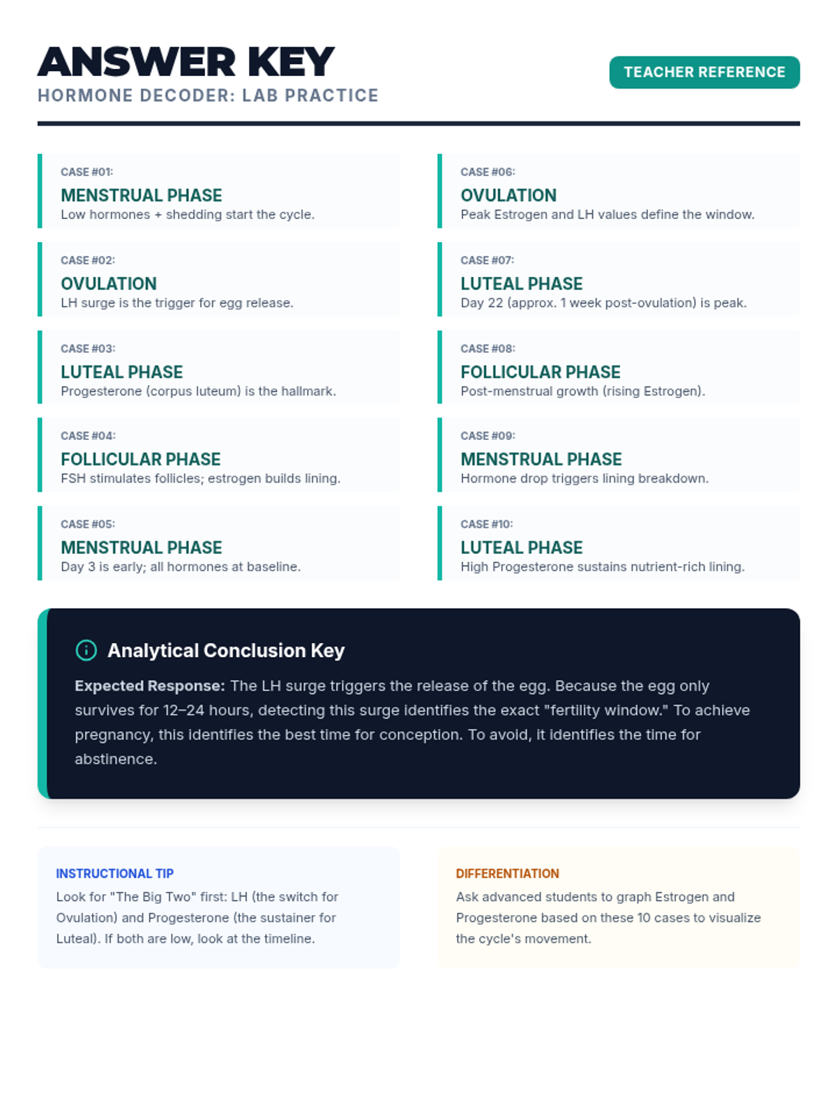 A teacher's answer key for the Hormone Decoder worksheet, providing the correct cycle phase for each of the 10 cases along with the biological reasoning for each identification.