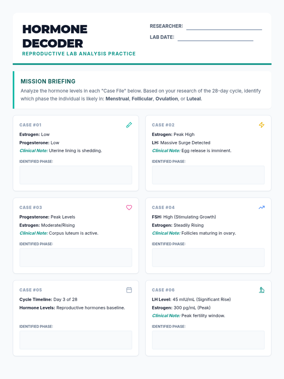 A practice worksheet with 10 case-study examples of hormone data where students must identify the corresponding phase of the menstrual cycle based on levels of Estrogen, Progesterone, LH, and FSH.