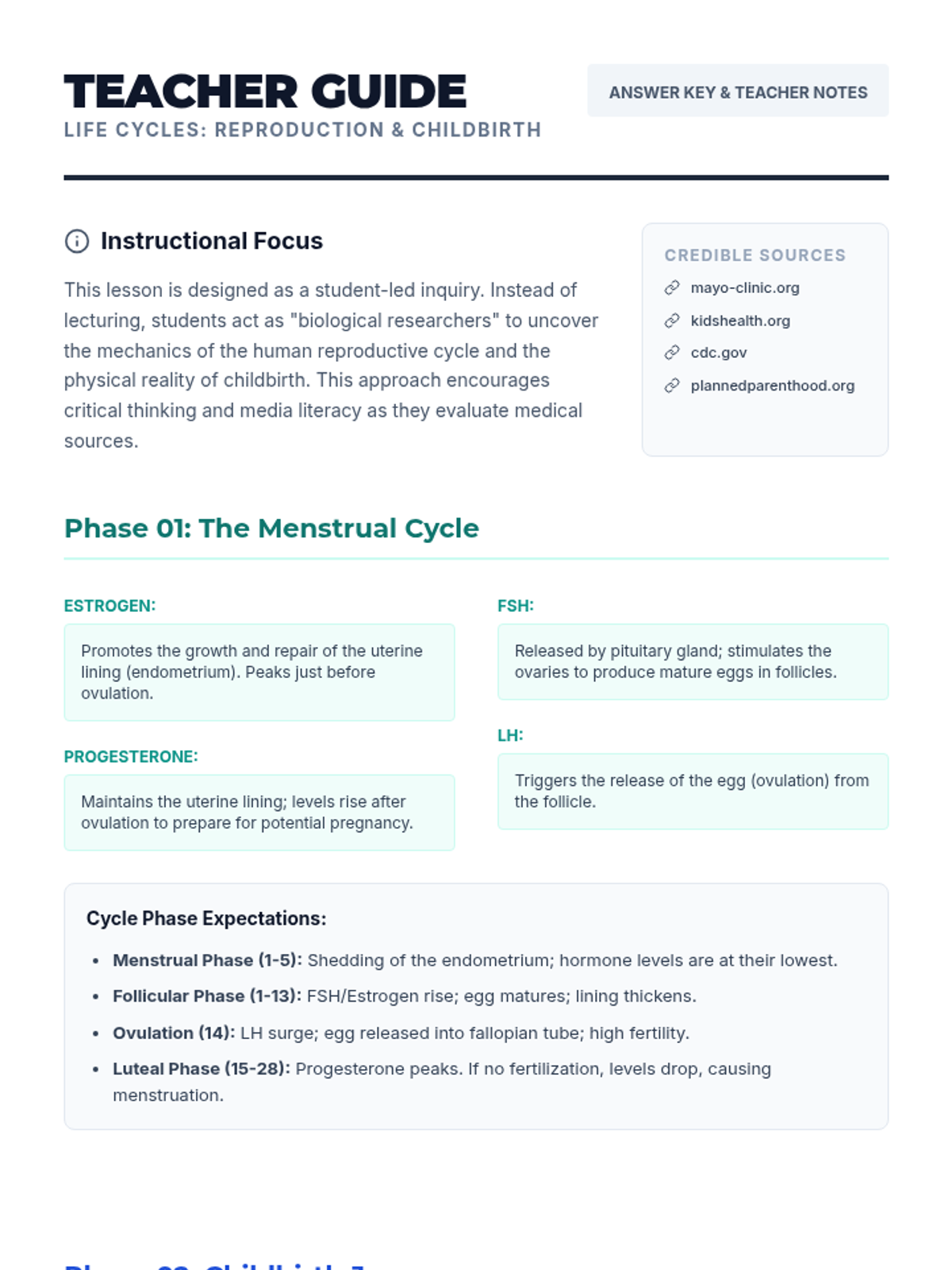 A teacher-facing guide and answer key for the Life Cycles lesson, providing expected research answers, discussion prompts, and clarification on common student misconceptions.