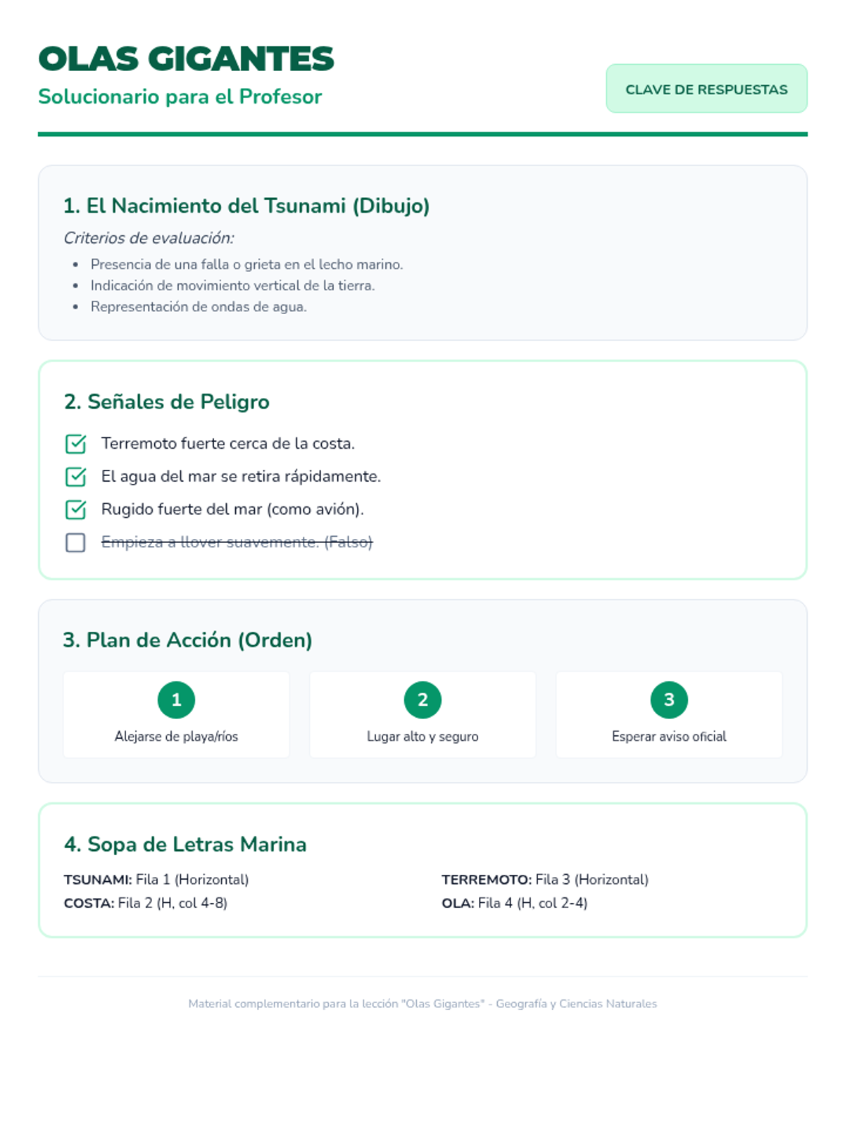 Guía de respuestas para el docente que acompaña la ficha "Olas Gigantes", detallando los criterios de evaluación y las respuestas correctas para las actividades de seguridad y vocabulario.