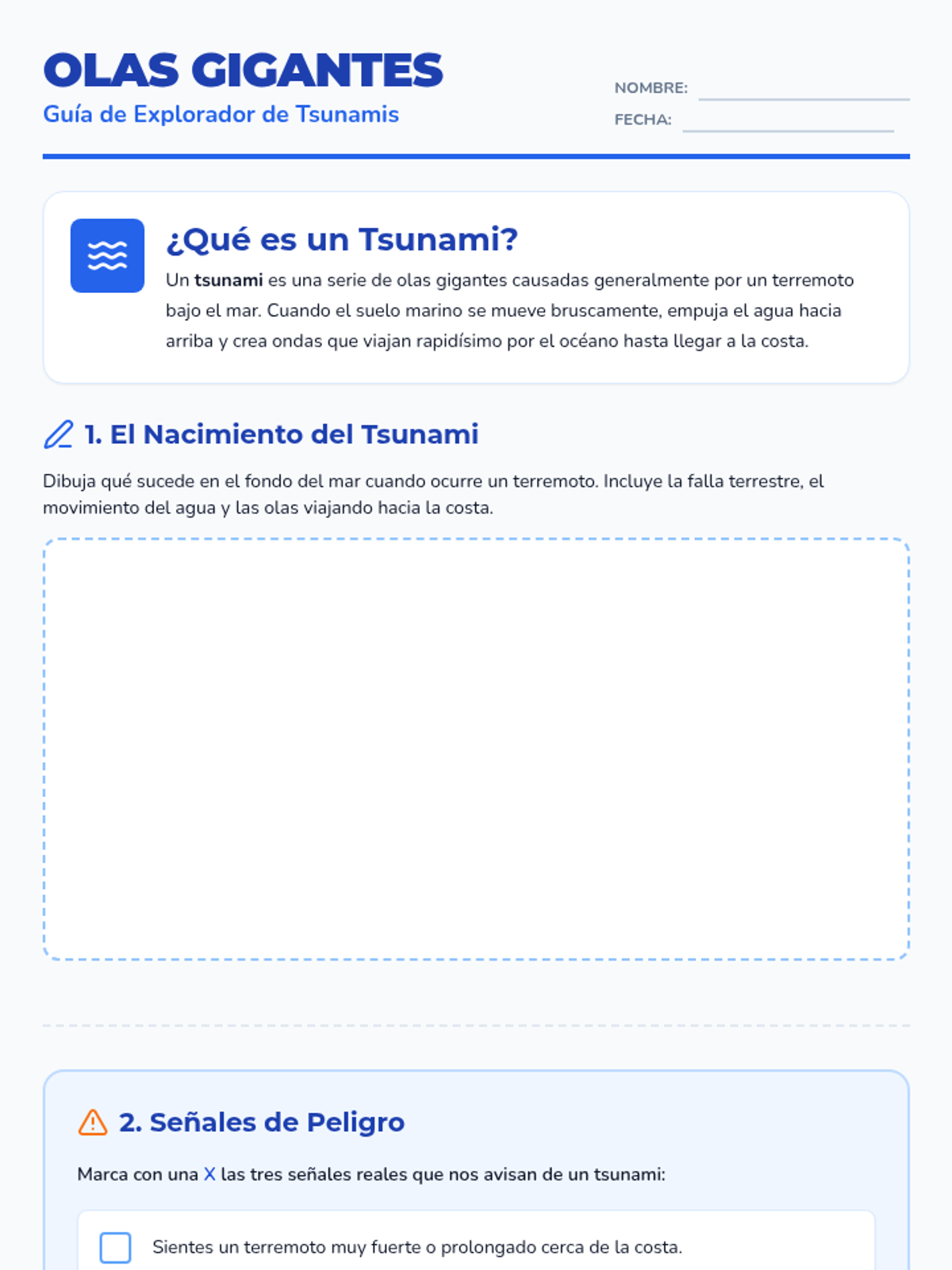 Una ficha de trabajo interactiva sobre tsunamis para niños, que incluye una explicación sencilla, dibujo del proceso, identificación de señales de peligro y pasos de seguridad.