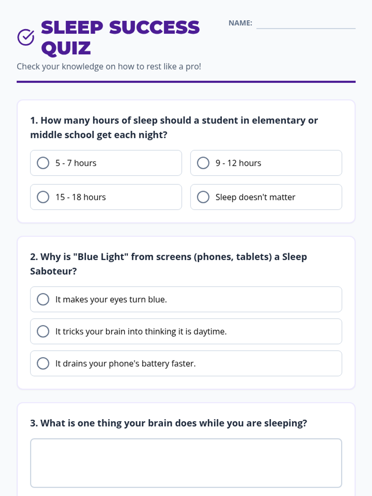 A short assessment for the 'Sleep Squad' lesson to evaluate student understanding of sleep requirements and habits. Revised for better contrast and page breaks.