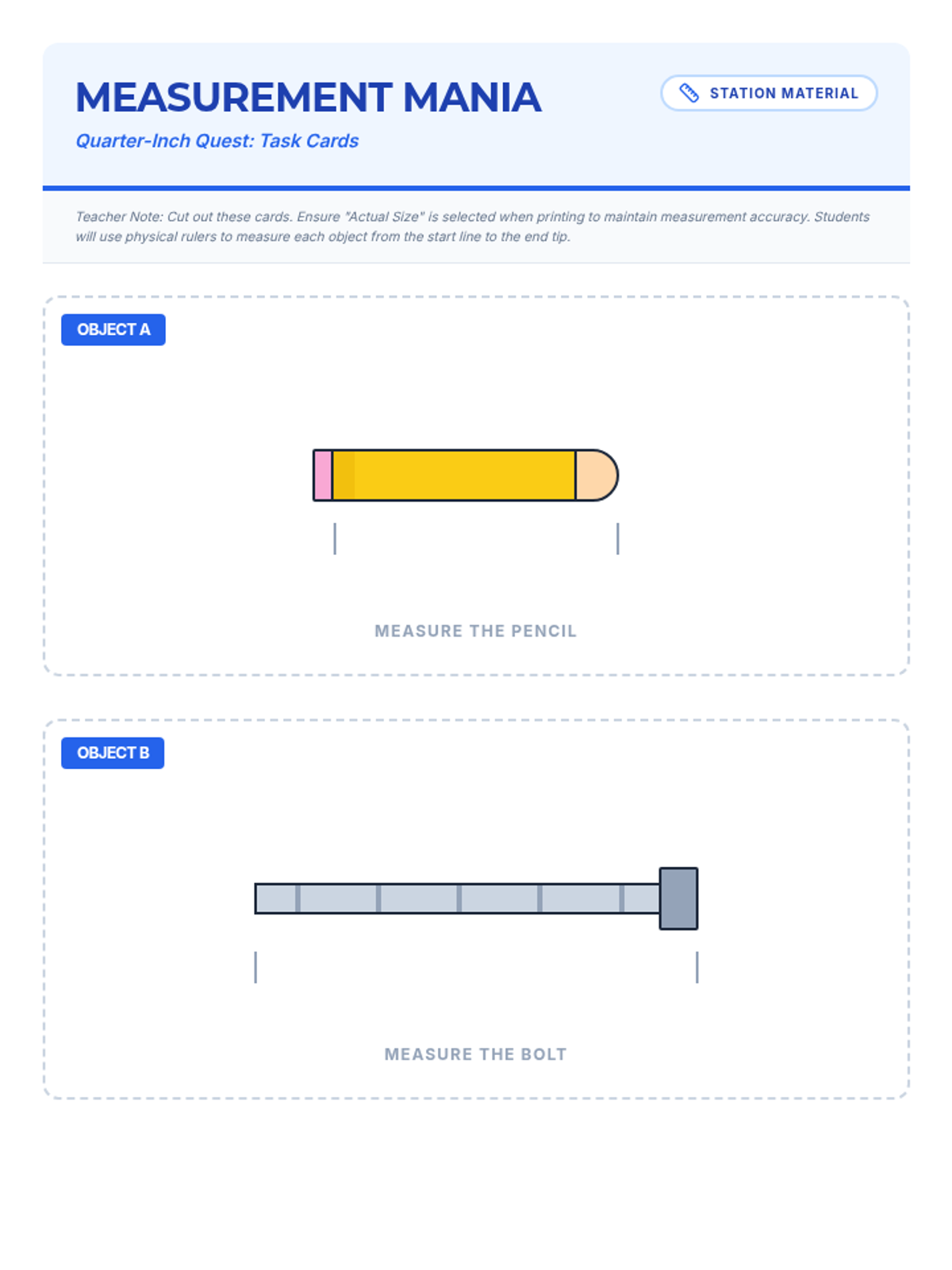 A set of 12 printable task cards featuring objects with specific lengths to be measured to the nearest quarter-inch. Each object is carefully sized at 96 pixels per inch to ensure accurate real-world measurement when printed at 100% scale. Updated with improved page breaks and spacing.