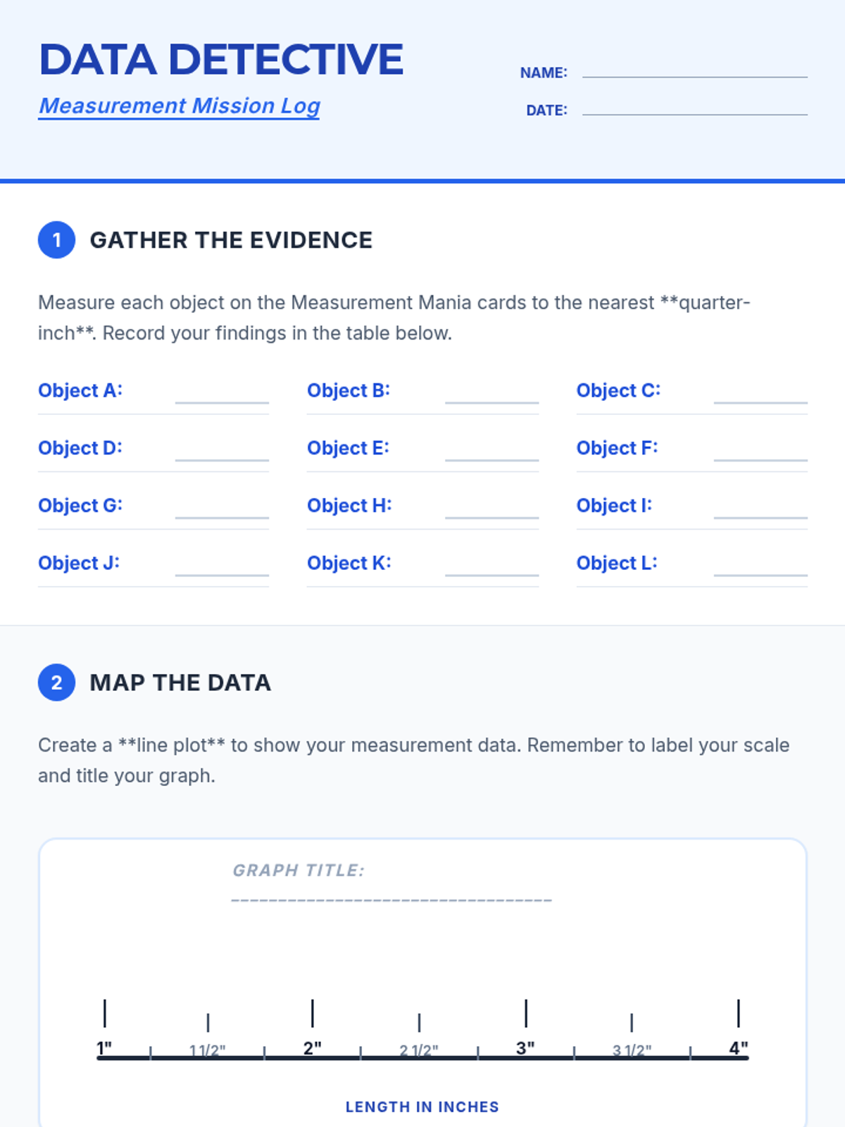 An individual recording sheet for students to document measurements from task cards, create a corresponding line plot, and analyze the data.