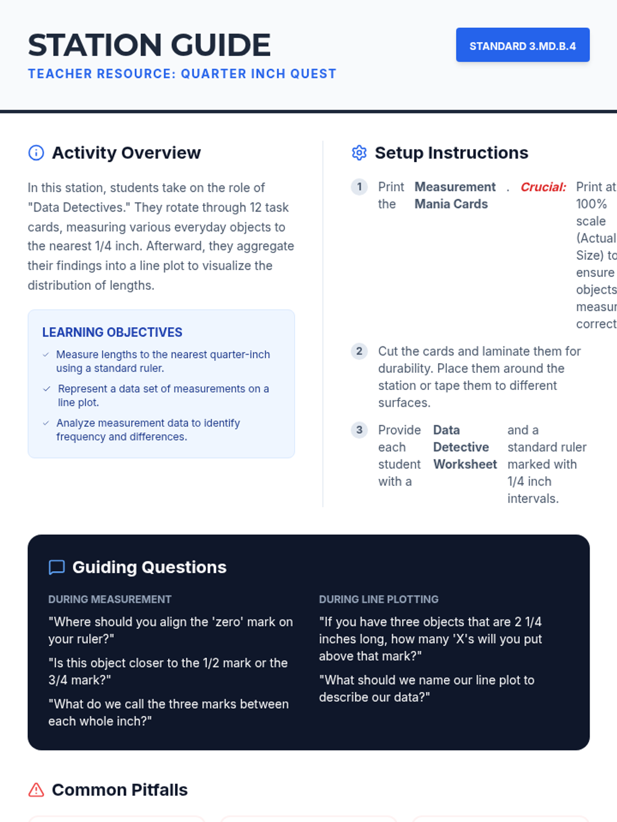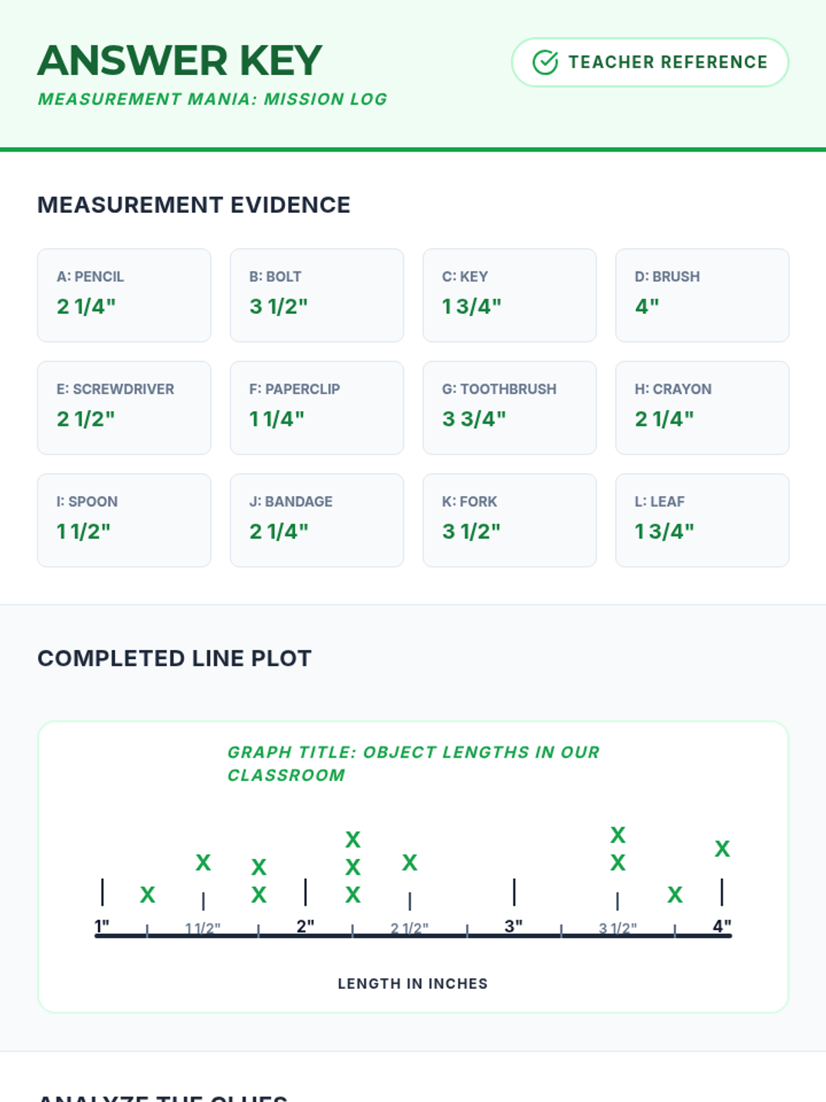 A complete answer key for the Quarter Inch Quest station, providing correct measurements for all task cards, a model line plot, and sample analysis answers.