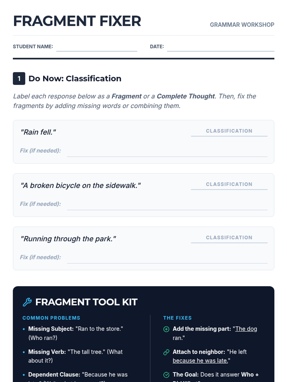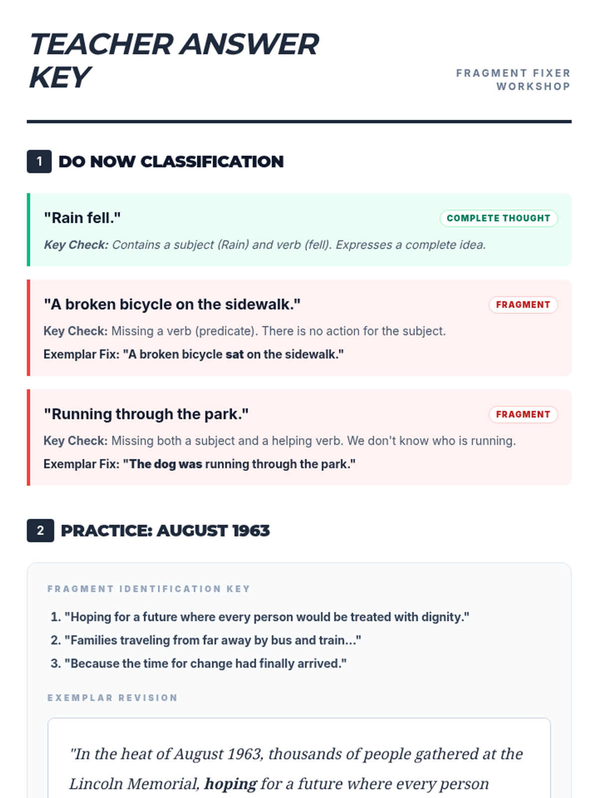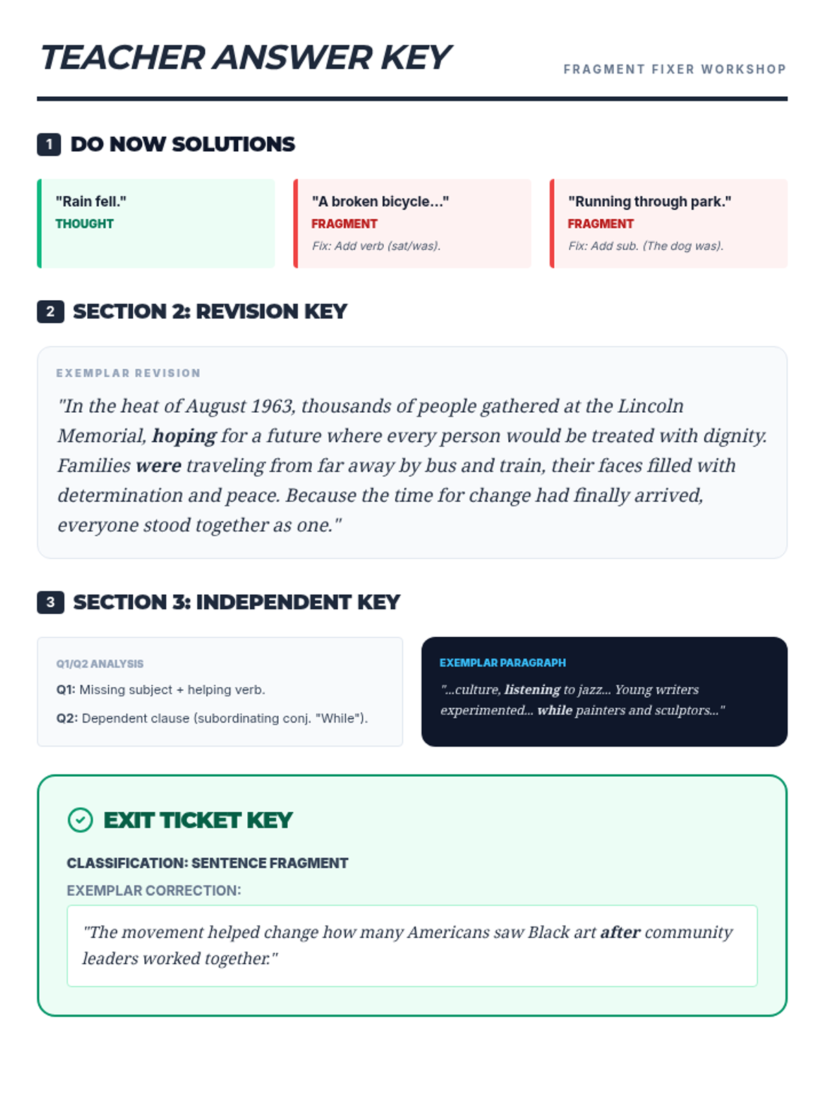 A condensed 1-page teacher answer key for the Fragment Fixer lesson. Aligned with the final 1-page student worksheet version.