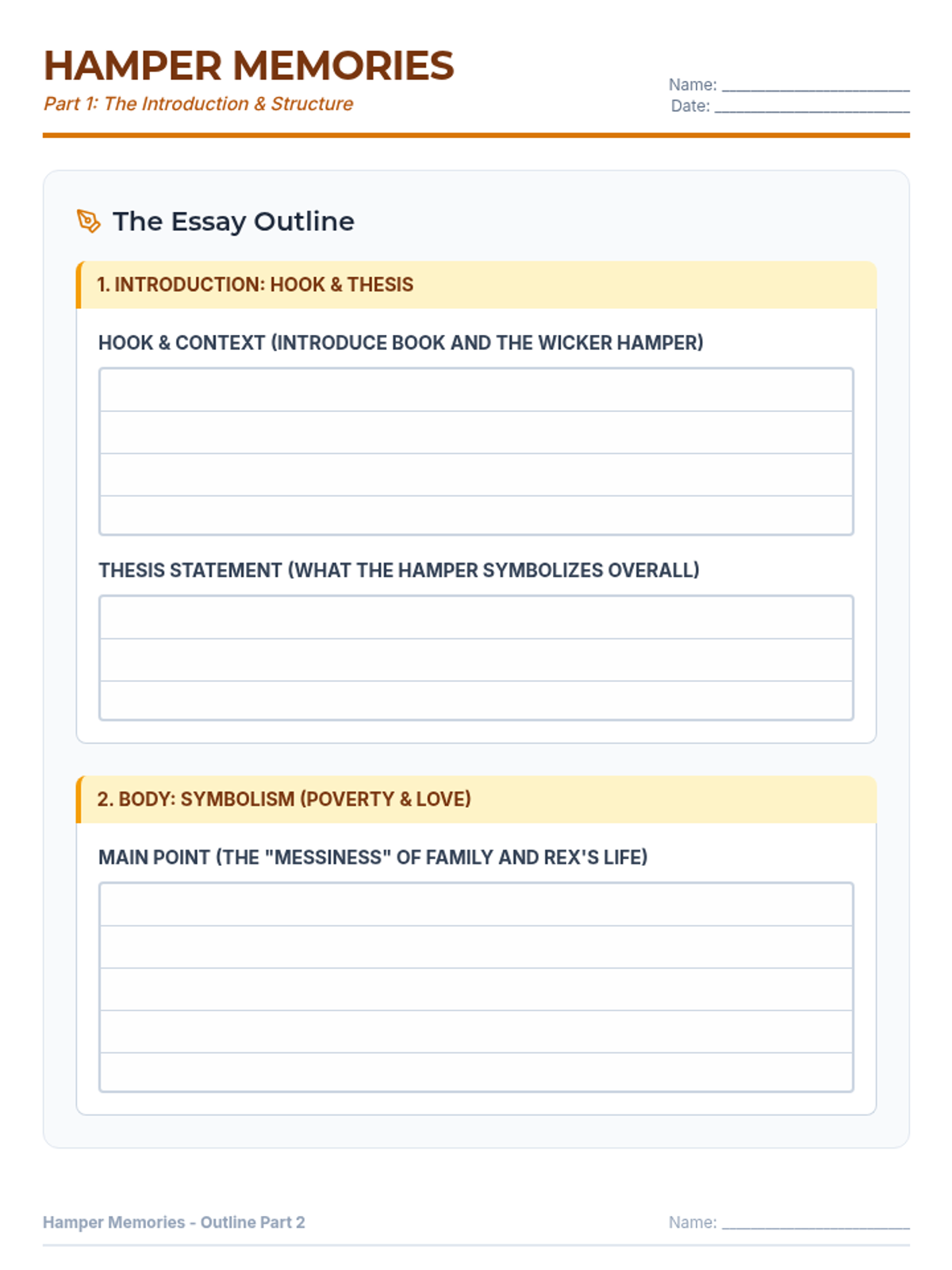 A comprehensive student worksheet featuring a scaffolded essay outline spread across two pages with handwriting lines for students, followed by a 6th-grade level example essay on a final page. The material analyzes the symbolism of the hamper in 'Abuela, Don't Forget Me' using a clear, thematic design.