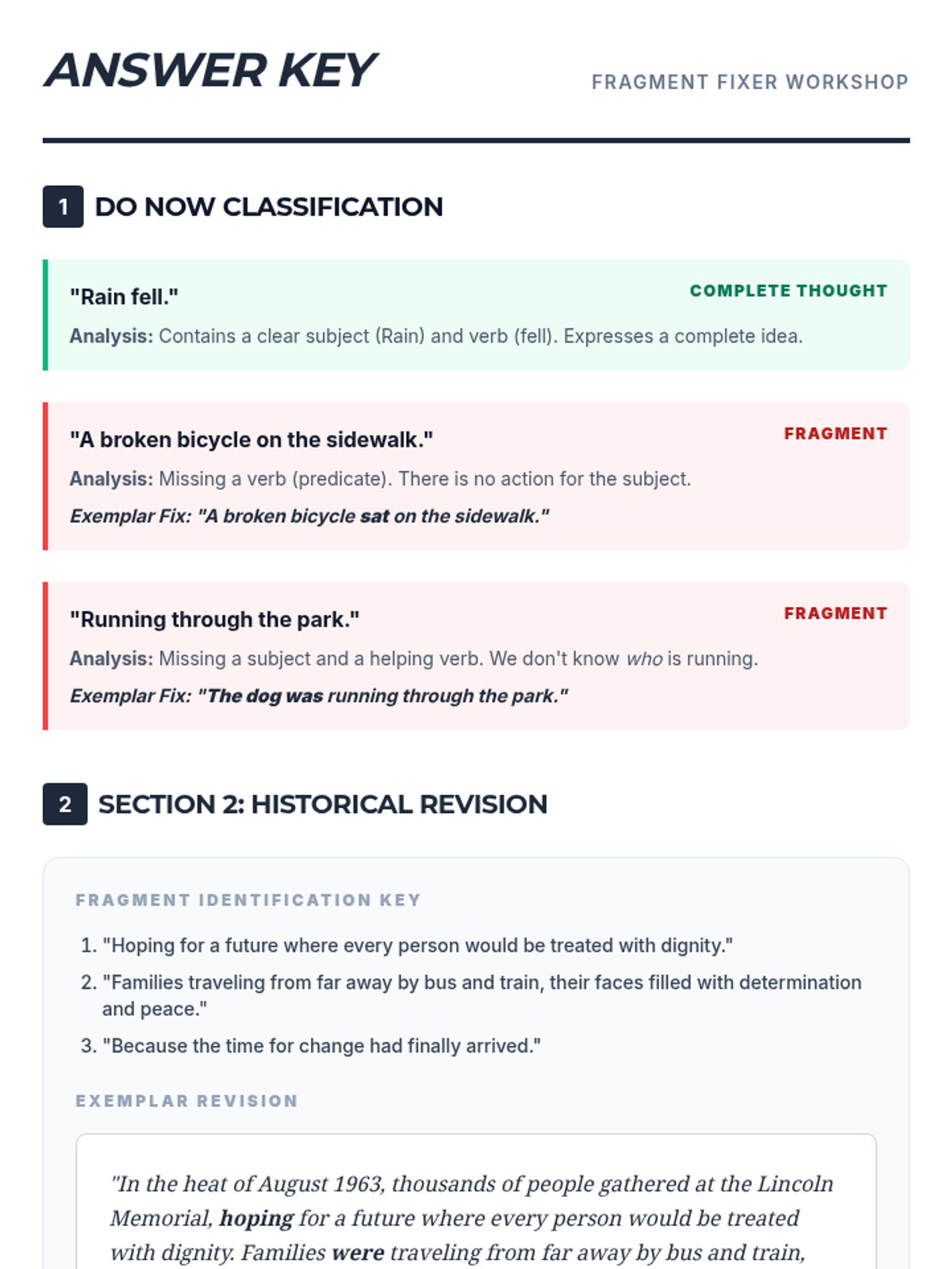 A detailed answer key for the Fragment Fixer lesson. It provides teacher analysis for all grammatical assessments, exemplar paragraph revisions for historical texts, and pedagogical notes for identifying common student misconceptions.