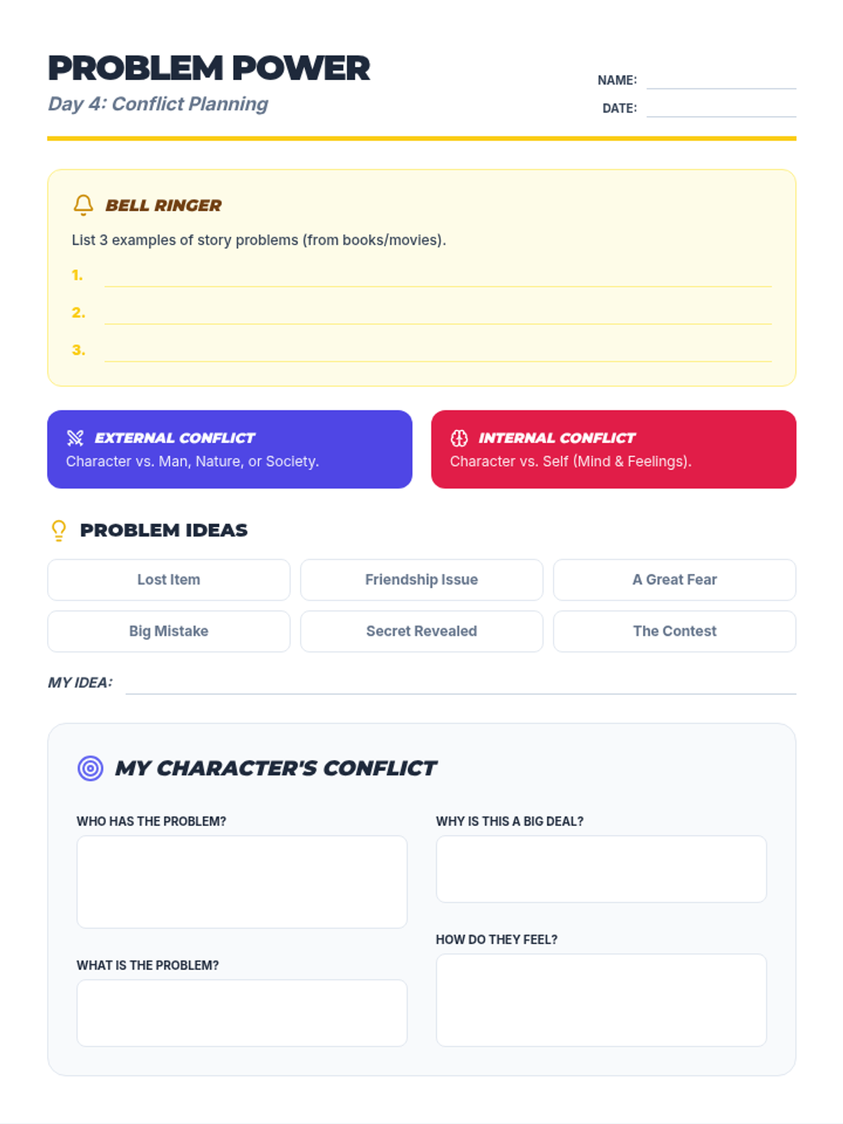 A polished student worksheet for brainstorming and developing a story's central conflict, featuring a bell ringer, writing task, and checklist.
