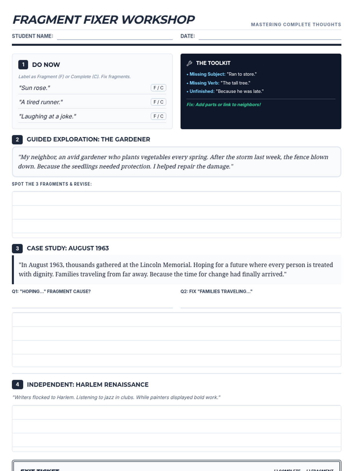 A 2-page student worksheet designed for a reteach lesson on sentence fragments. It includes a Do Now diagnostic, a "Fragment Tool Kit" reference section, guided practice on historical texts (March on Washington), independent application on the Harlem Renaissance, and a final Exit Ticket.
