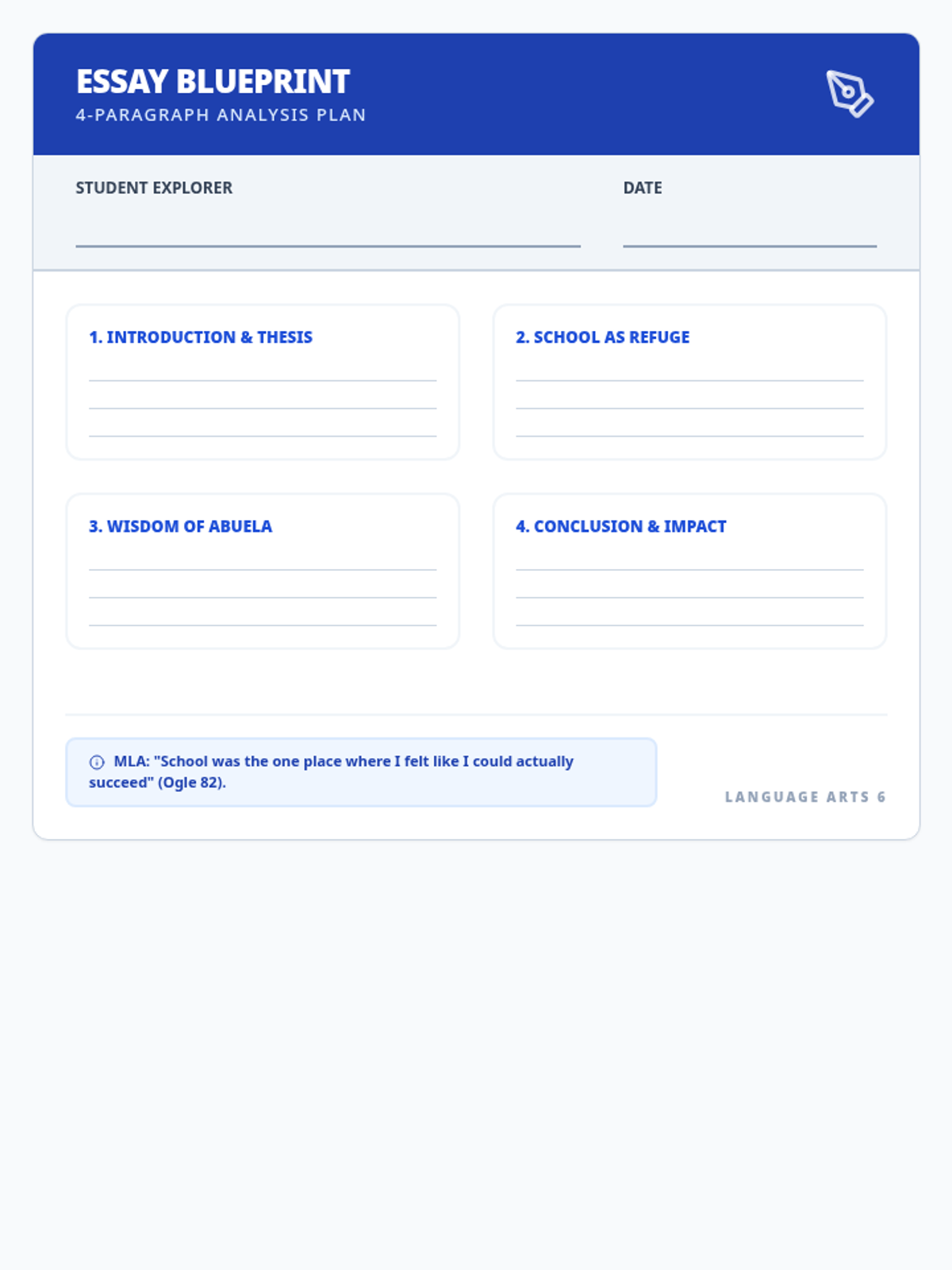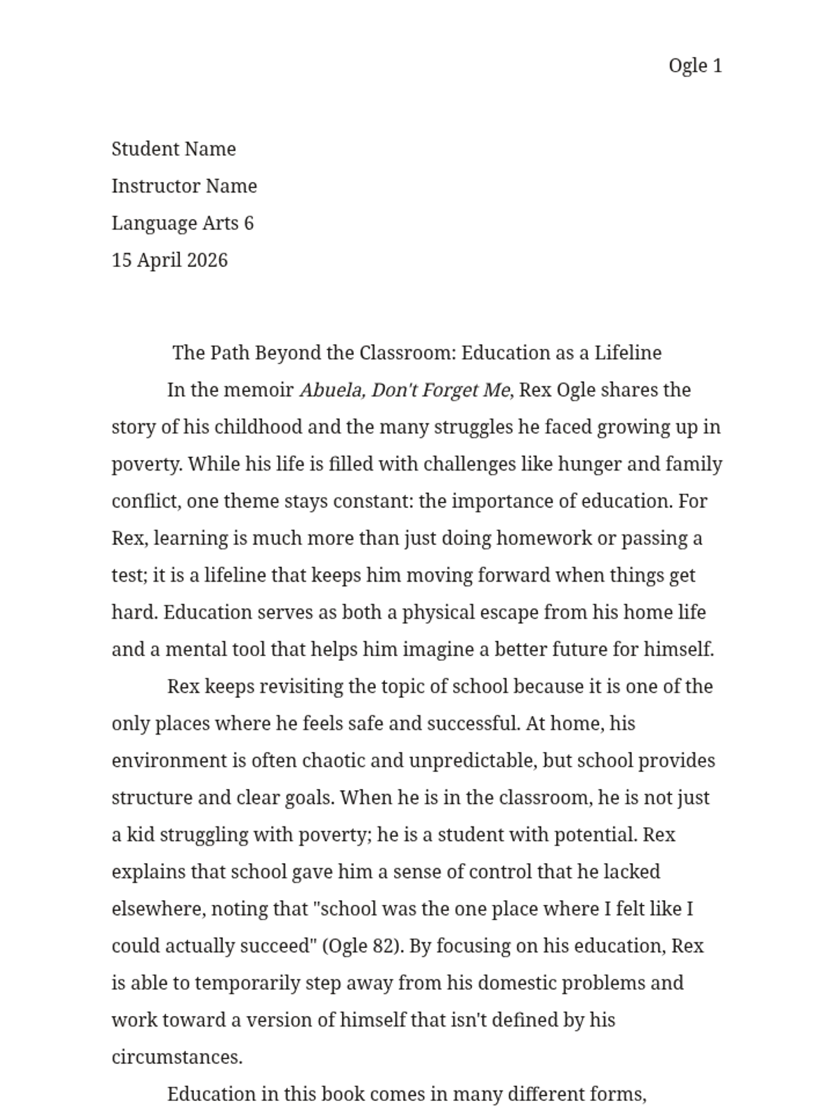 A 4-paragraph exemplar essay for 6th-grade students analyzing the role of education in Rex Ogle's memoir. It includes standard MLA formatting and focuses on education as both a safe haven and a source of wisdom.
