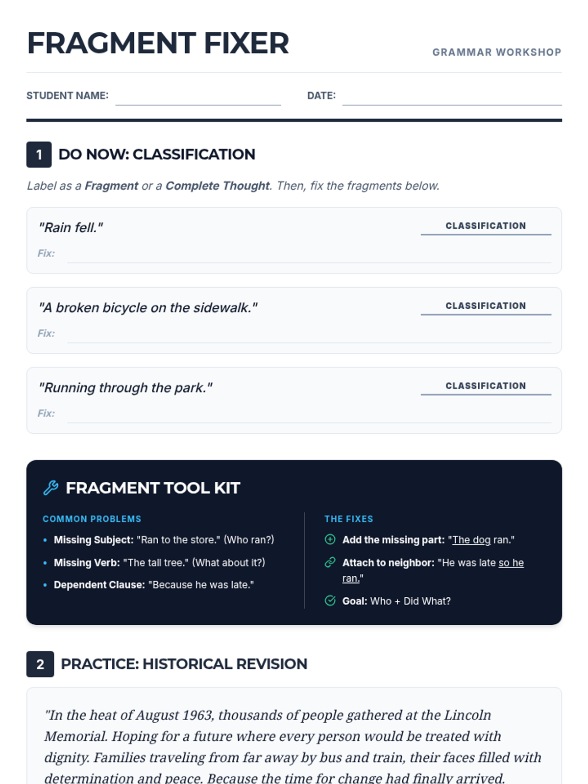 A 2-page student worksheet designed for a reteach lesson on sentence fragments. It includes a Do Now diagnostic, a condensed "Fragment Tool Kit" reference section, guided practice on historical texts, and an independent application mission. Layout optimized to ensure reference tools and work areas fit perfectly on 2 pages.