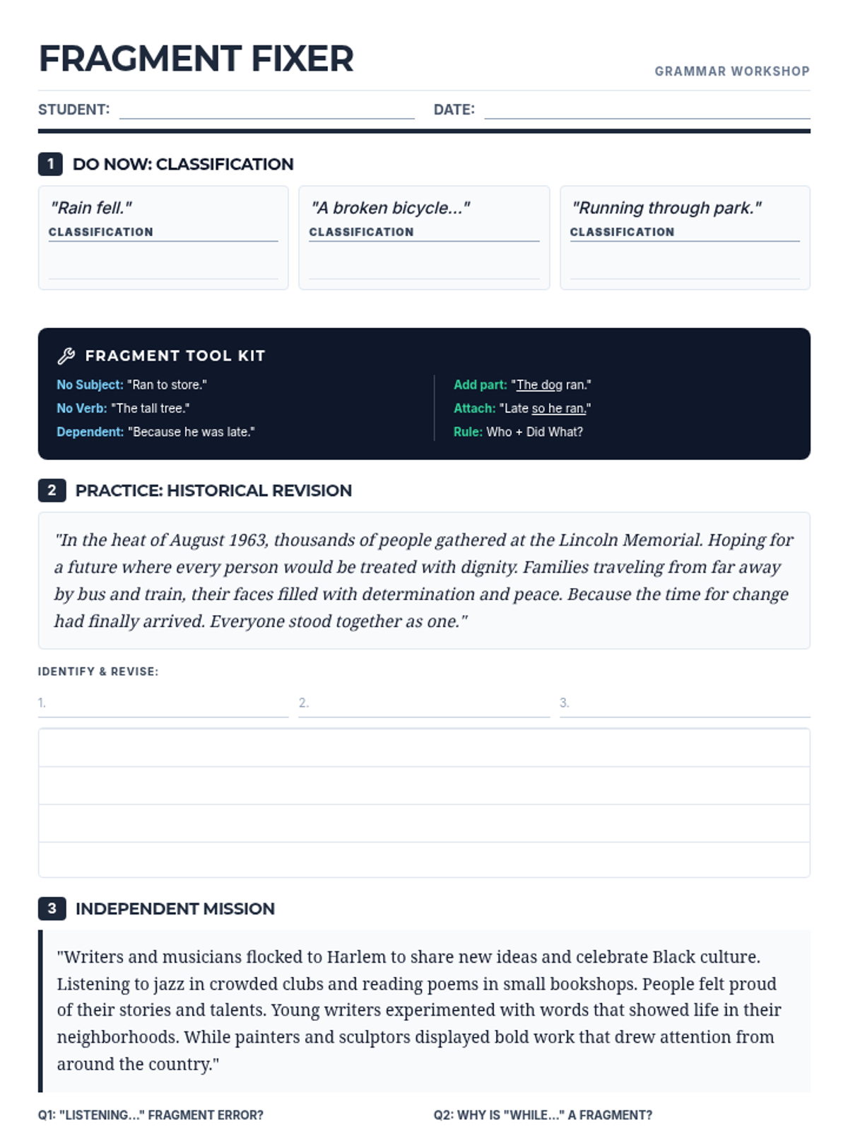 A detailed teacher answer key and pedagogical guide for the Fragment Fixer lesson. It provides exhaustive grammatical analysis for all changed questions, exemplar paragraph revisions for historical texts, and specific monitoring notes for teachers to identify student misconceptions. Alignment verified with worksheet v2.