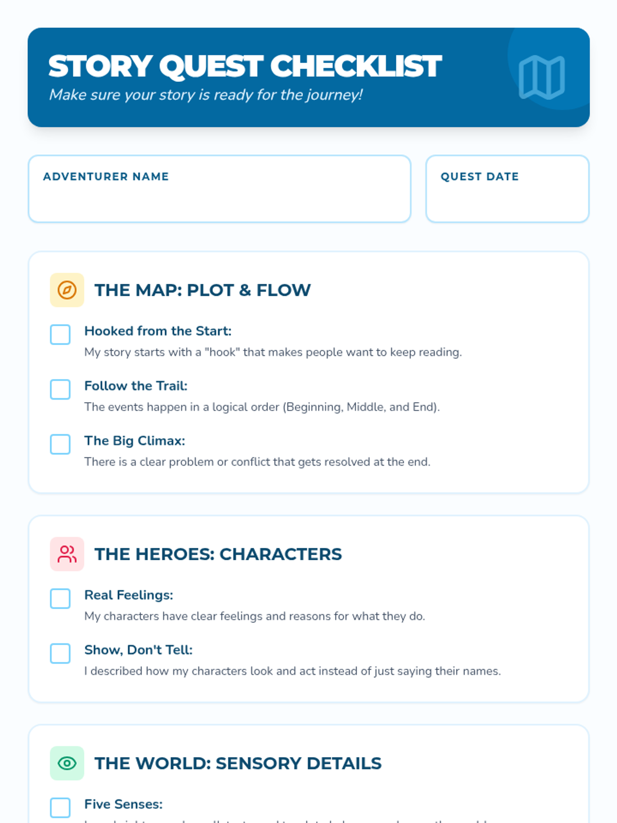 A student-friendly self-assessment checklist for narrative writing, themed as a "Story Quest" with clear goals and reflection space.